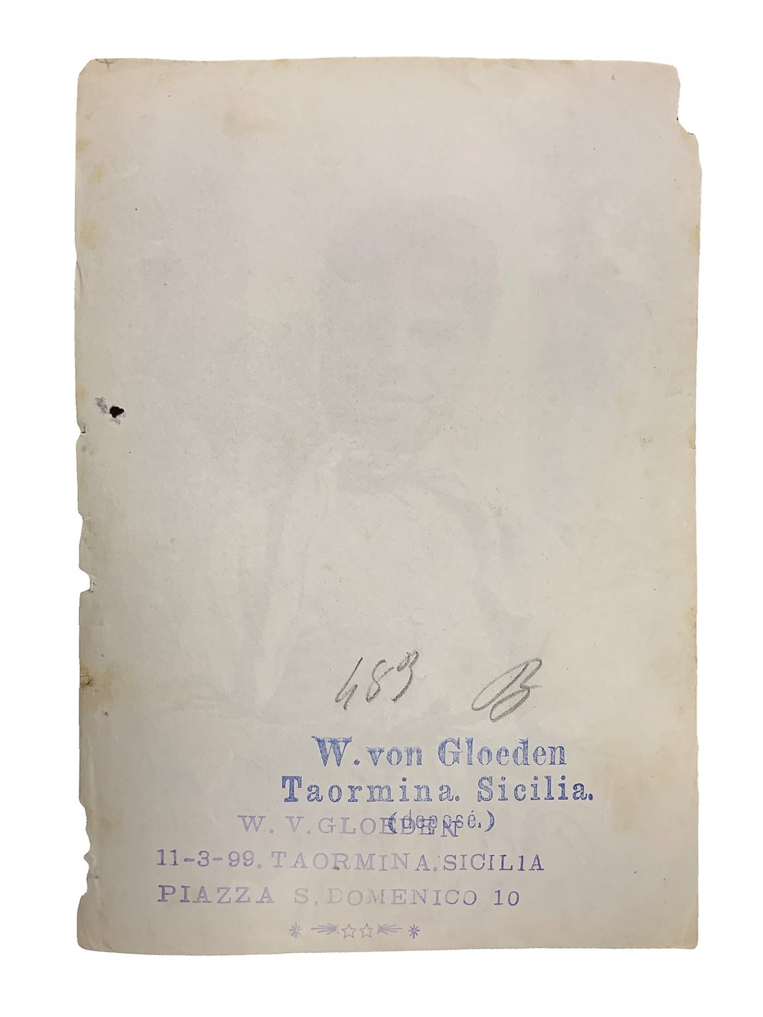 11,5x17 cm Giovane siciliano Foto all’albumina Numerata sul retro 489 e timbrata. Piccole mancanze sul lato destro e in alto a sinistra.