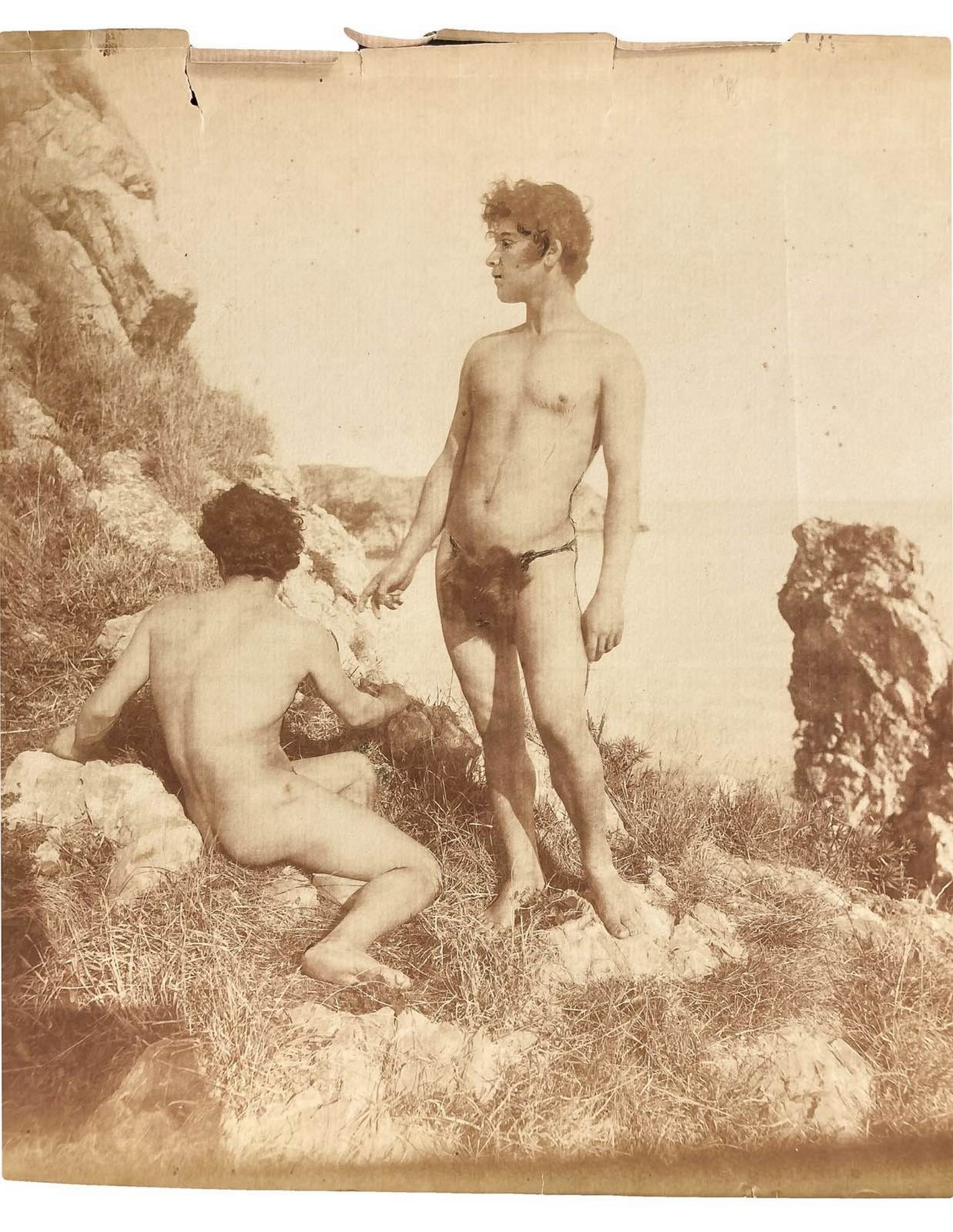 Cm 30x40. 1913 ca Scena idilliaca tra efebi sulla costa taorminese stampa fotografica vintage all’albumina su carta salata virata Lievi mancanze sul bordo inferiore. Priva di timbro.