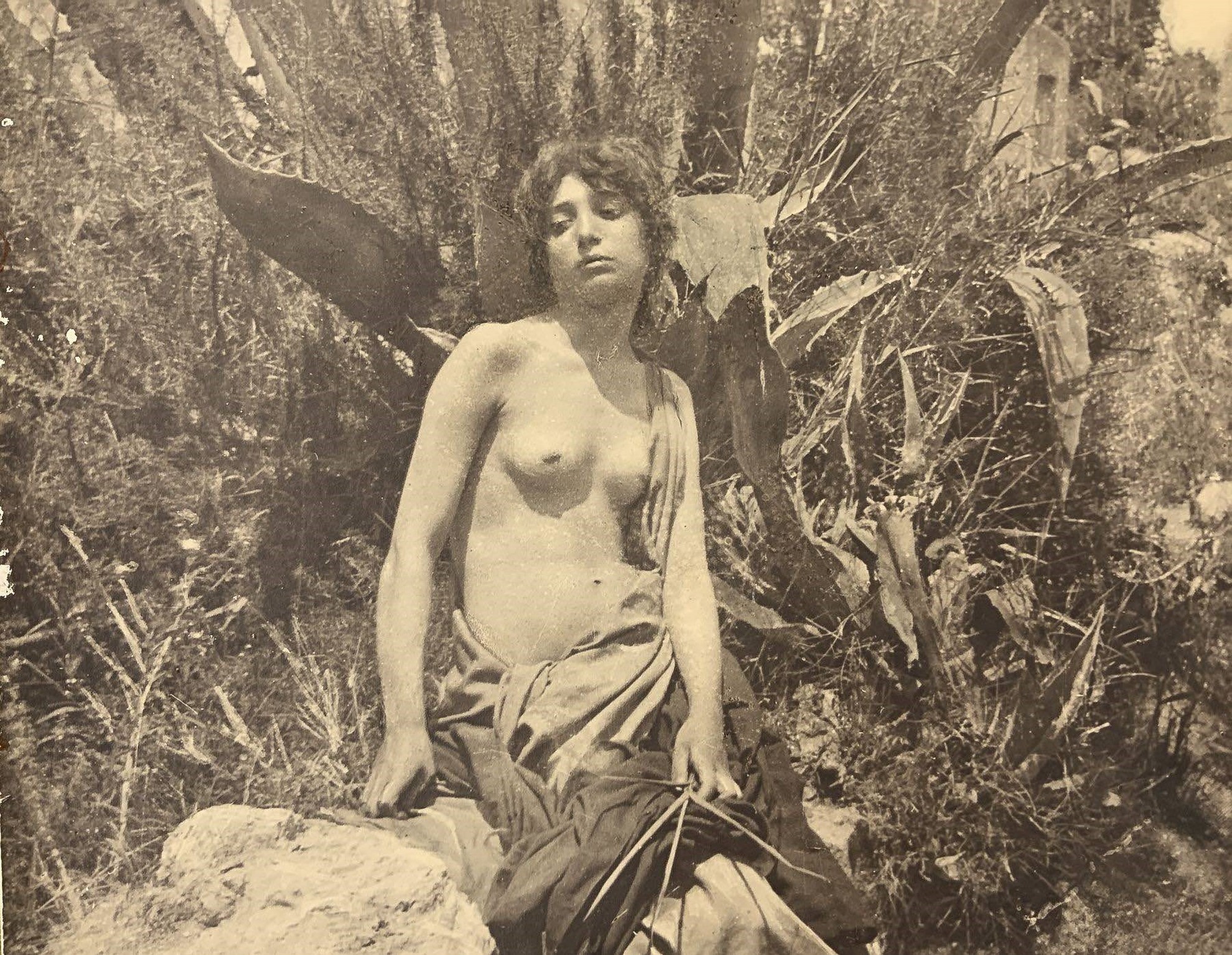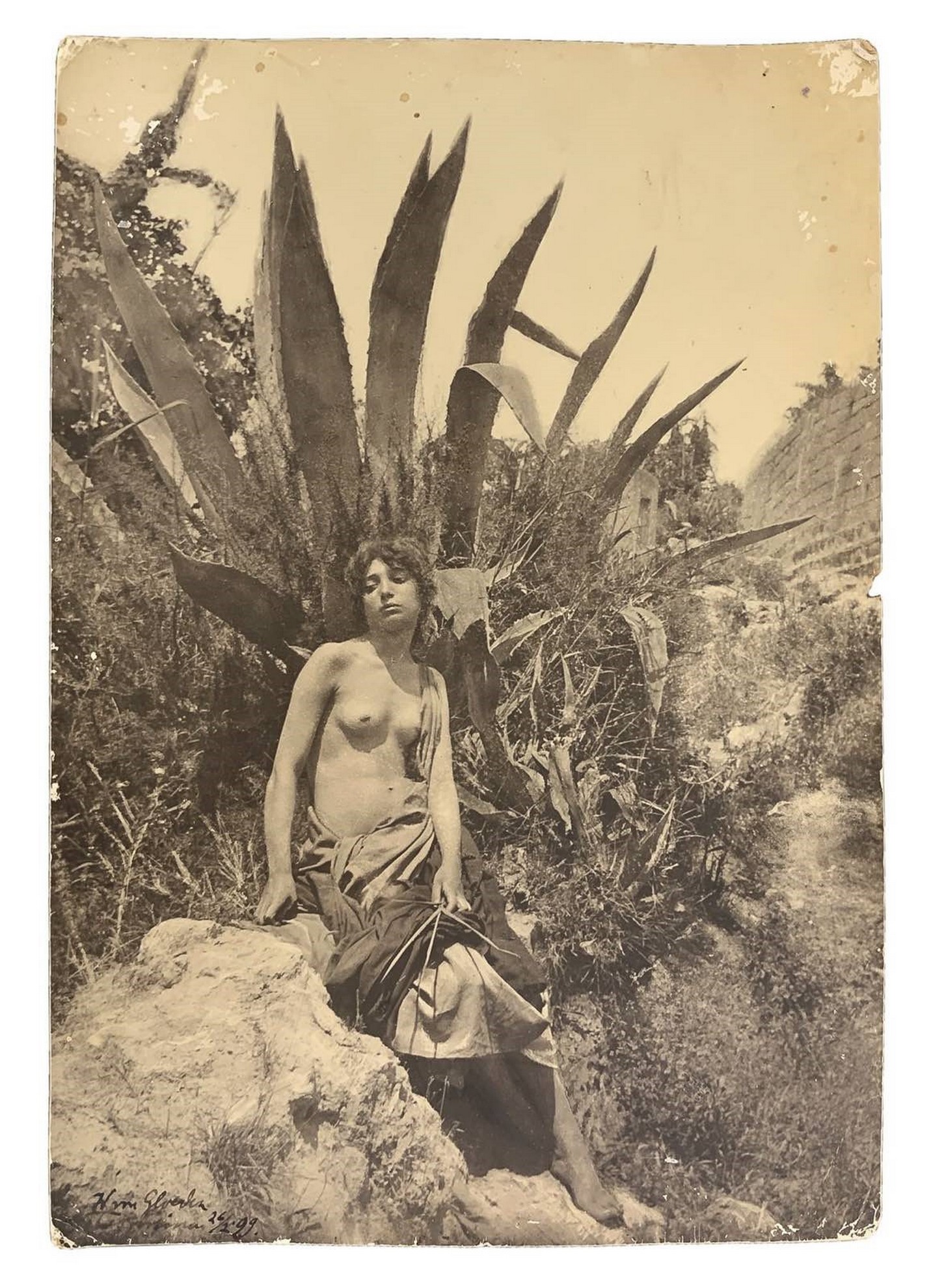 Cm 40x27 c 1910 Donna seminuda e agave stampa fotografica vintage su carta salata Firmata al verso e sul retro. Lievi mancanze ai bordi inferiori. Firmata sul retro.