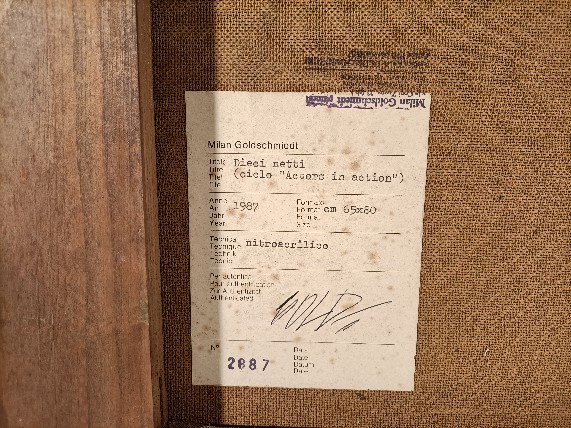 Al retro: etichetta e timbro dell'Atelier dell'autore con tutta la descrizione dell'opera con numero d'archivio 2887.