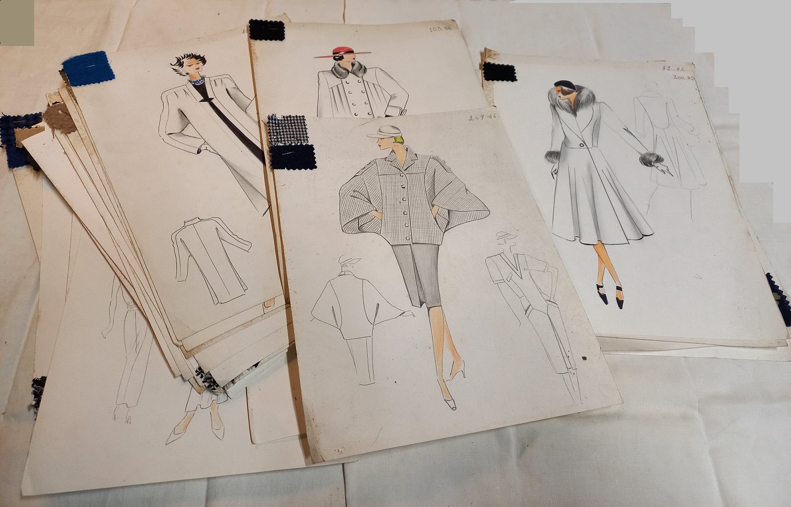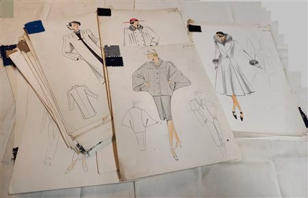 NUMEROSI BOZZETTI VINTAGE PER ABITI CON CAMPIONI DI TESSUTO