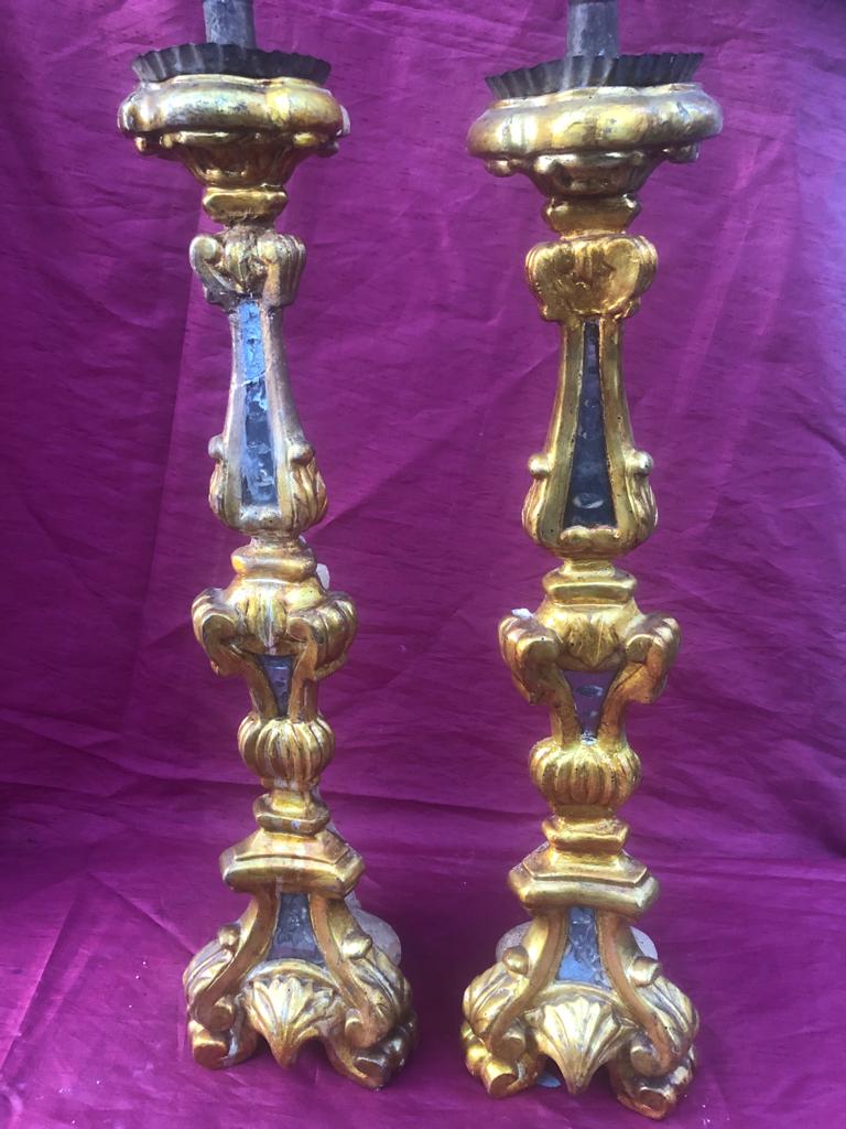 COPPIA DI TORCIERE IN LEGNO DORATO E SPECCHI XVIII SECOLO H.CM.64