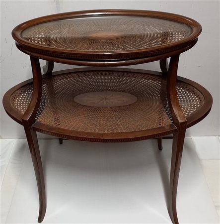 ETAGERE PORTAVASSOIO OVALE IN LEGNO INTARSIATO E FILETTATO CON VASSOIO XIX SECOLO CM.87X48 H.86