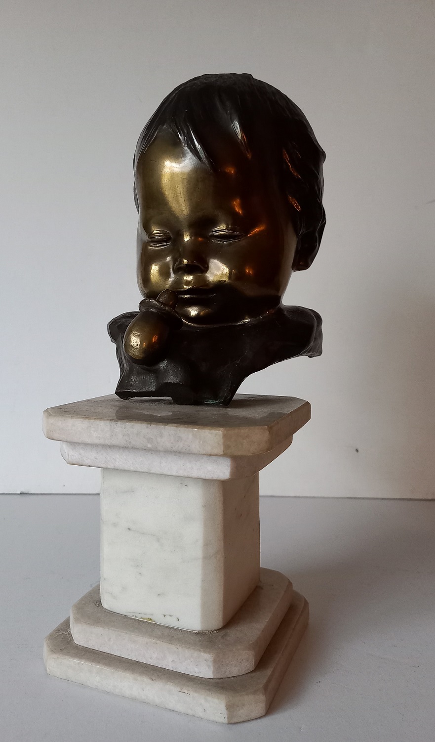 IGNOTO - TESTA DI BAMBINO FUSIONE IN BRONZO H.CM.20 CON BASE IN MARMO H.TOT.CM.33