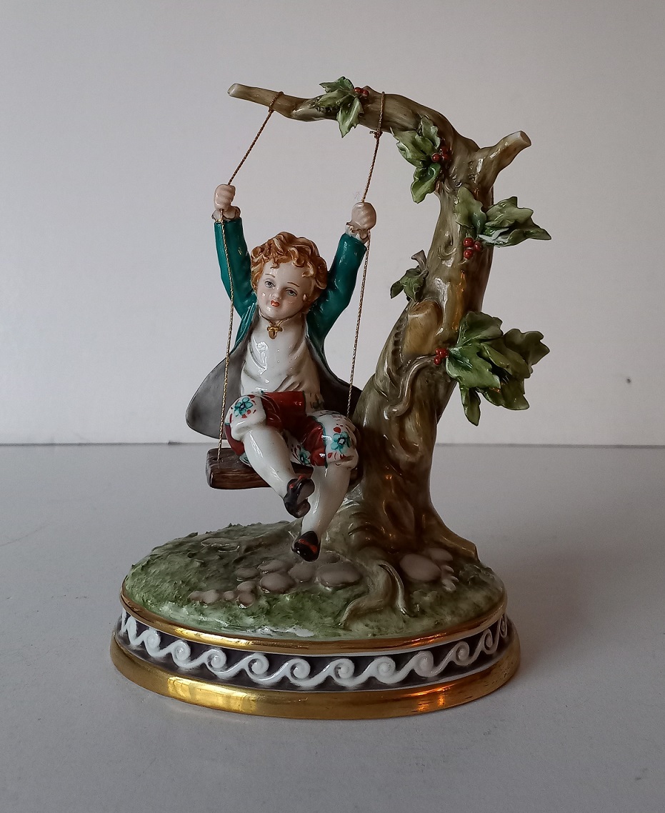 CAPODIMONTE - GRUPPO IN PORCELLANA POLICROMA E DORATA CON FANCIULLO SU ALTALENA H.CM.21 MARCHIO SOTTO LA BASE