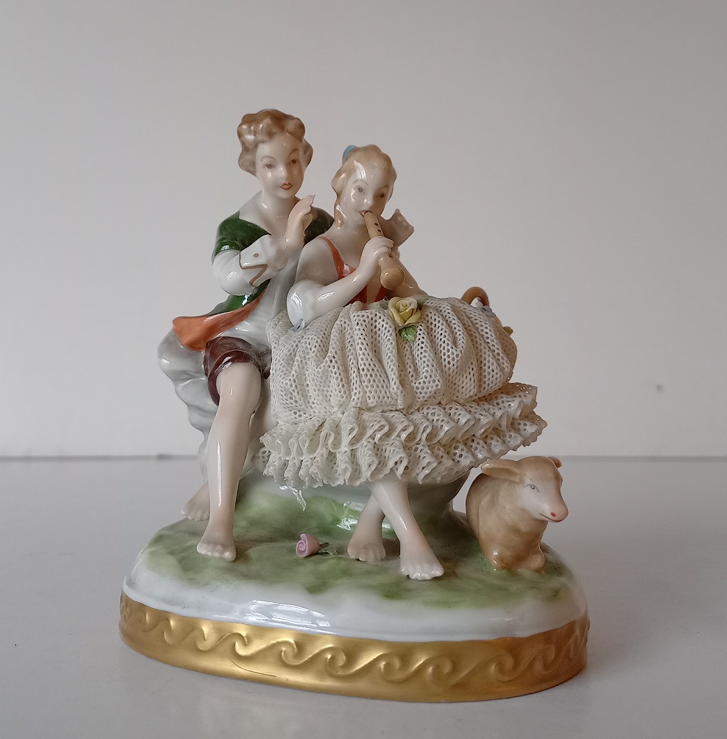GRUPPO IN PORCELLANA POLICROMA E DORATA CON DAMA E CAVALIERE H.CM.13