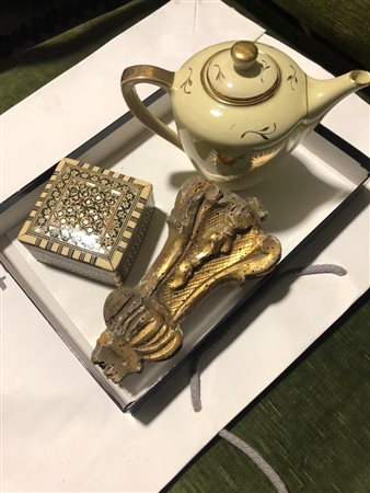 SCATOLA FANTASIA CON SCATOLINA INTARSIATA E OGGETTI VARI