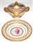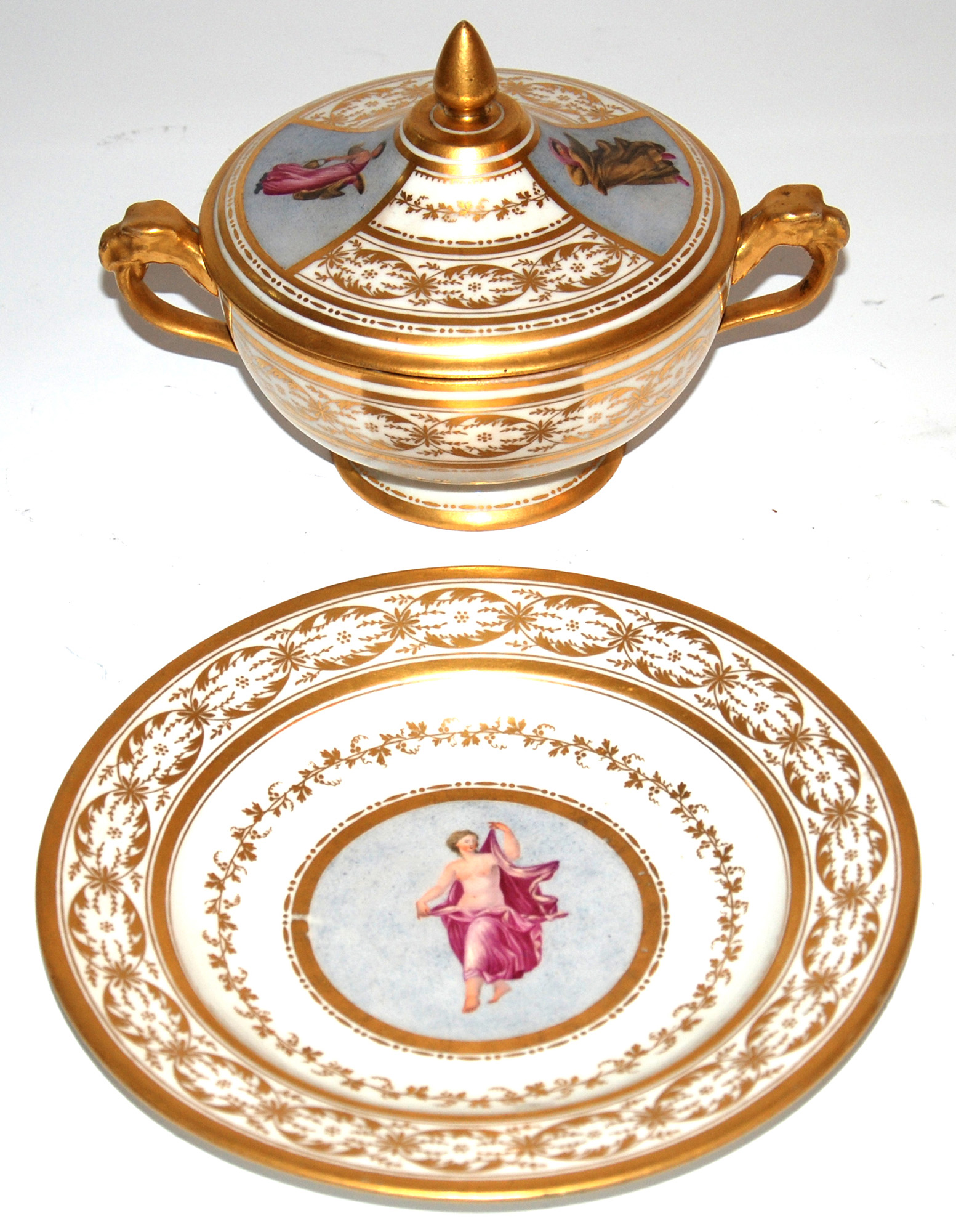 Tazza da brodo con coperchio e piatto, decorata con figure policrome, ricche dorature a fasce con motivi geometrici, marchio n coronata in blu, real fabbrica della porcellana di Napoli, 1800 circa