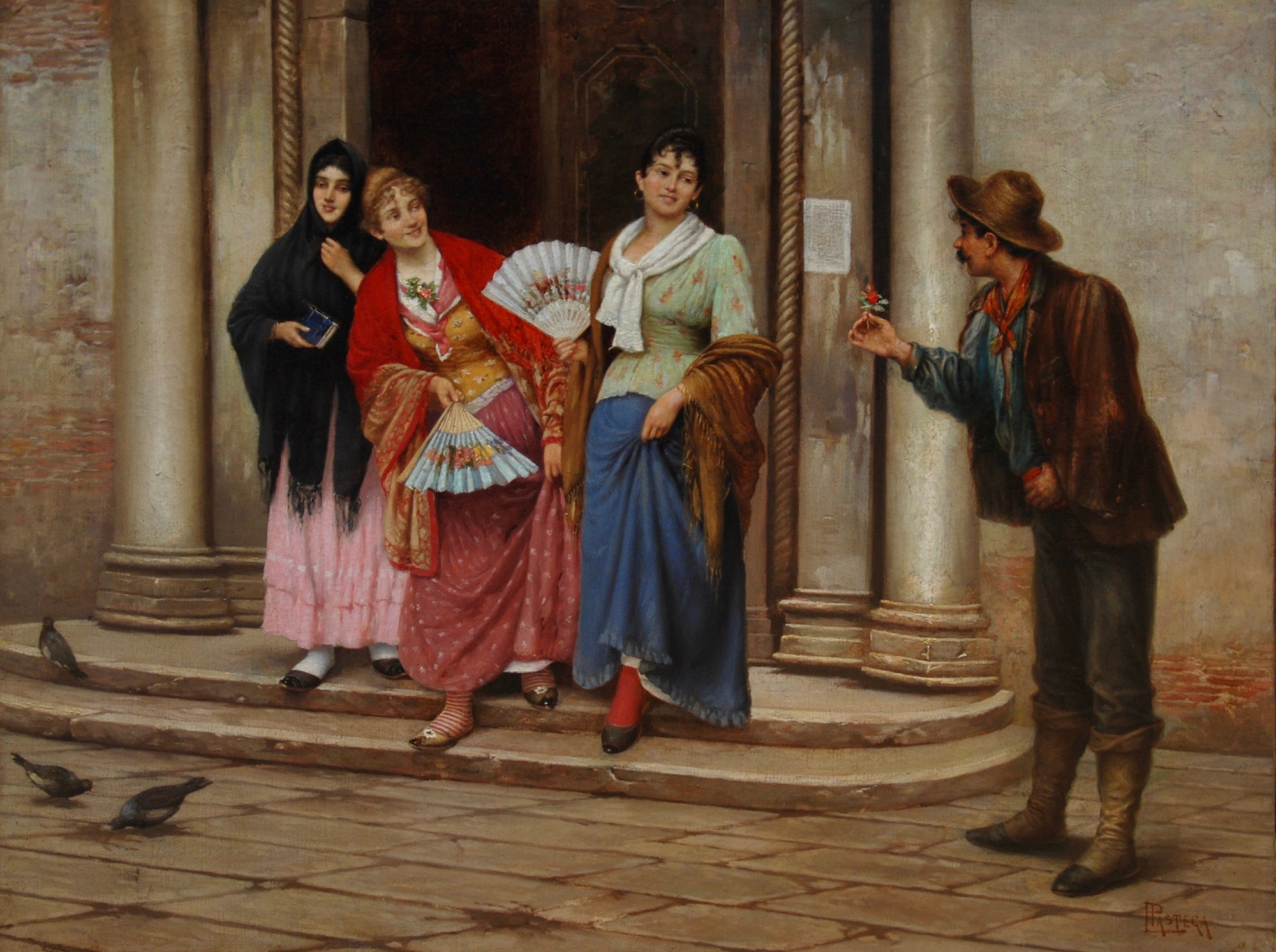 Luigi Pastega (Venezia 1858 - 1927) "Uscita dalla chiesa", olio su tela, firmato in basso a destra.
