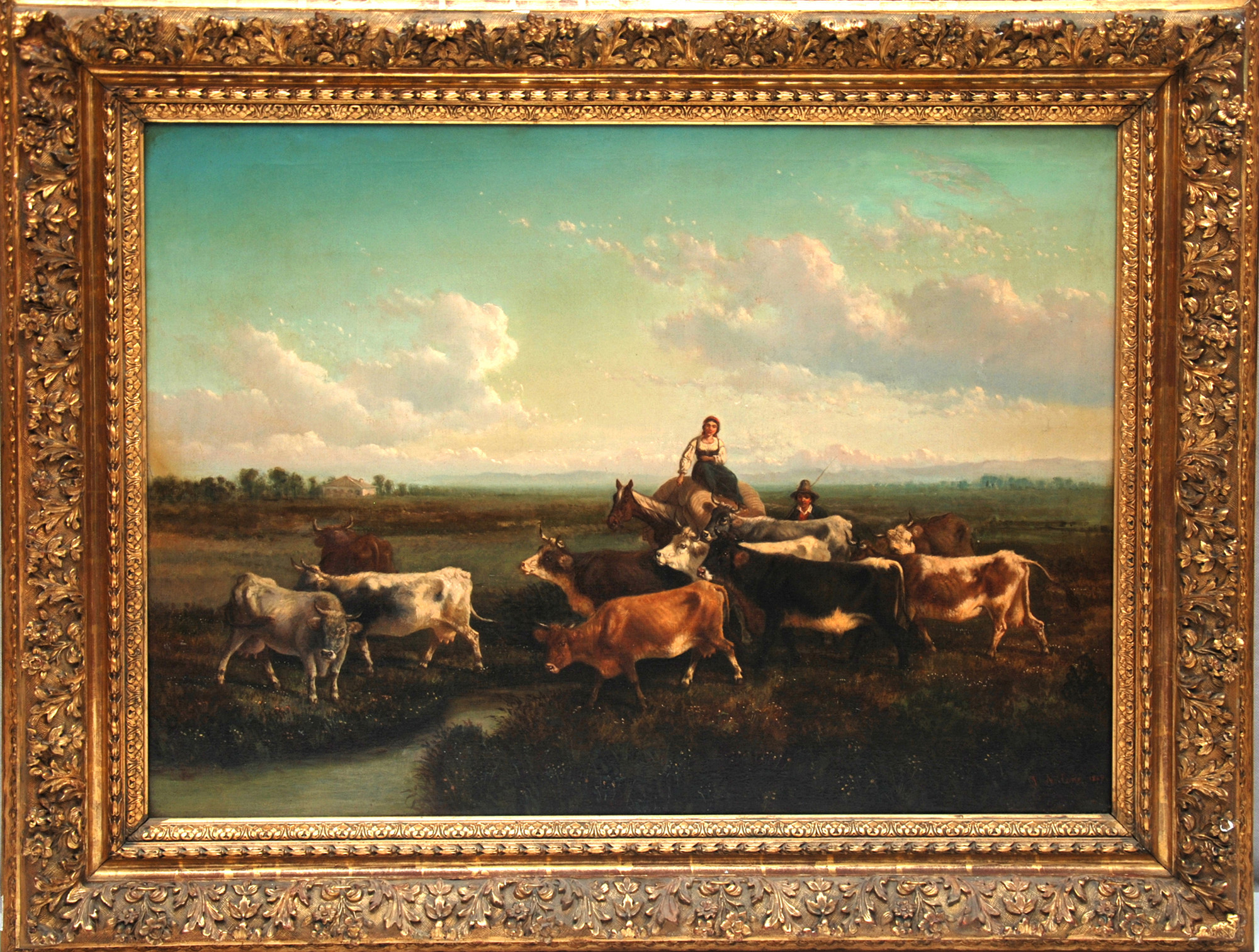 Antonio Milone (Napoli 1834 - 1919) olio su tela raff."paesaggio con contadini e armenti" firmato in basso a destra.