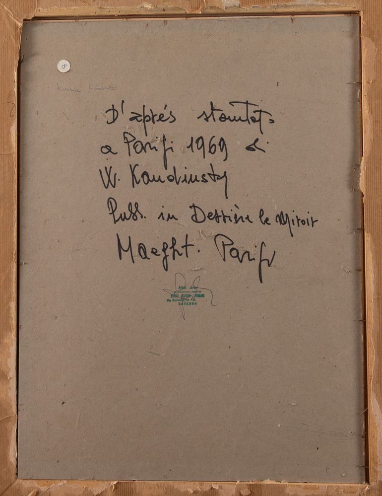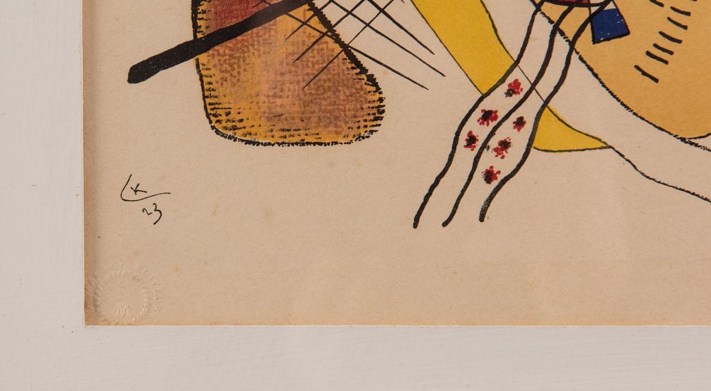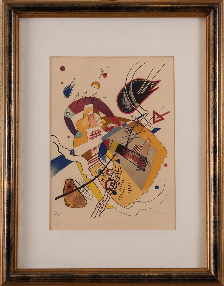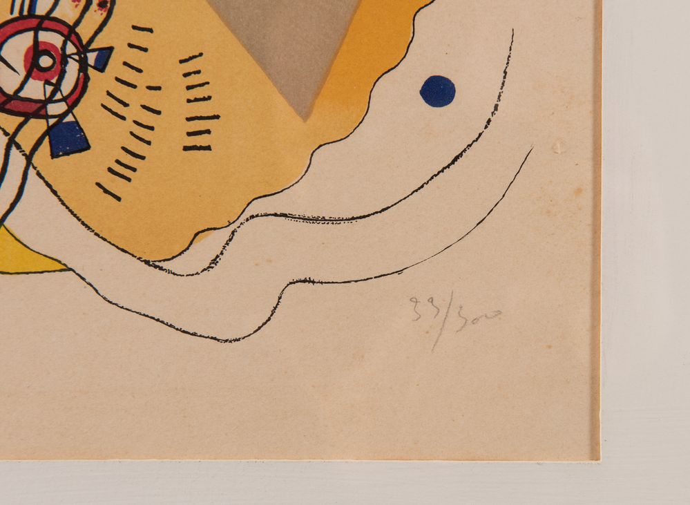 WASSILY KANDINSKY (Mosca 1886 - Neuilly-sur-Seine 1944) "Bonne humeur", 1923-1957. Litografia a colori su carta. Cm 38x27,8. Firma in lastra in basso a sinistra con monogramma. Reca numeri di tiratura in basso a destra. Al retro reca timbro con firma di Mimi Arte, Ravenna. Da Derrière Le Miroir n°101-102-103, 1957. Pubblicato da Maeght editore, Parigi. Stampato da Mourlot, Parigi.