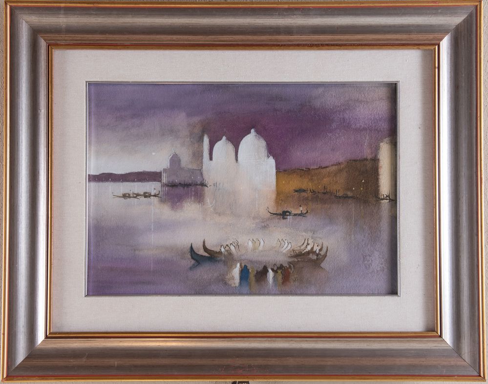 GINO TRAME (Venezia 1939) "Pesca in laguna", 1986. Acquerello su carta. Cm 34,3x49. Opera firmata in basso a destra Trame. Al retro opera intitolata, datata e firmata Pesca in Laguna Venezia 1986 Gino Trame.