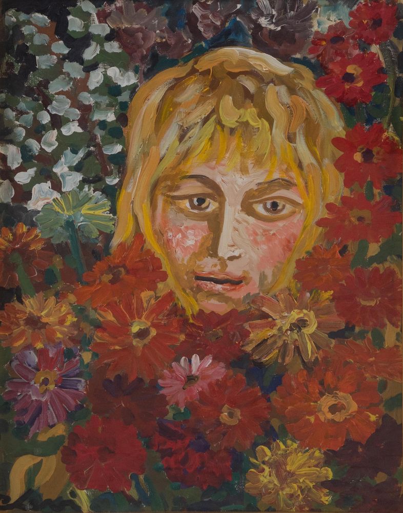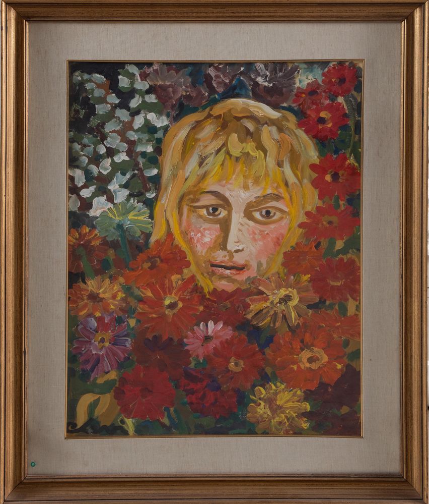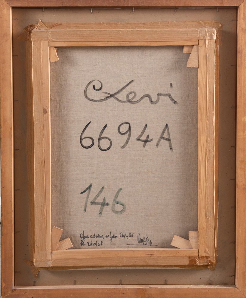 CARLO LEVI (Torino 1902 - Roma 1975) "Donna tra i fiori". Olio su tela. Cm 65,5x50. Opera firmata in basso a sinistra C. Levi. Al retro opera firmata C. Levi. Al retro reca iscrizione 6694A146, apportata dall'artista e legata alla datazione della realizzazione dell'opera.