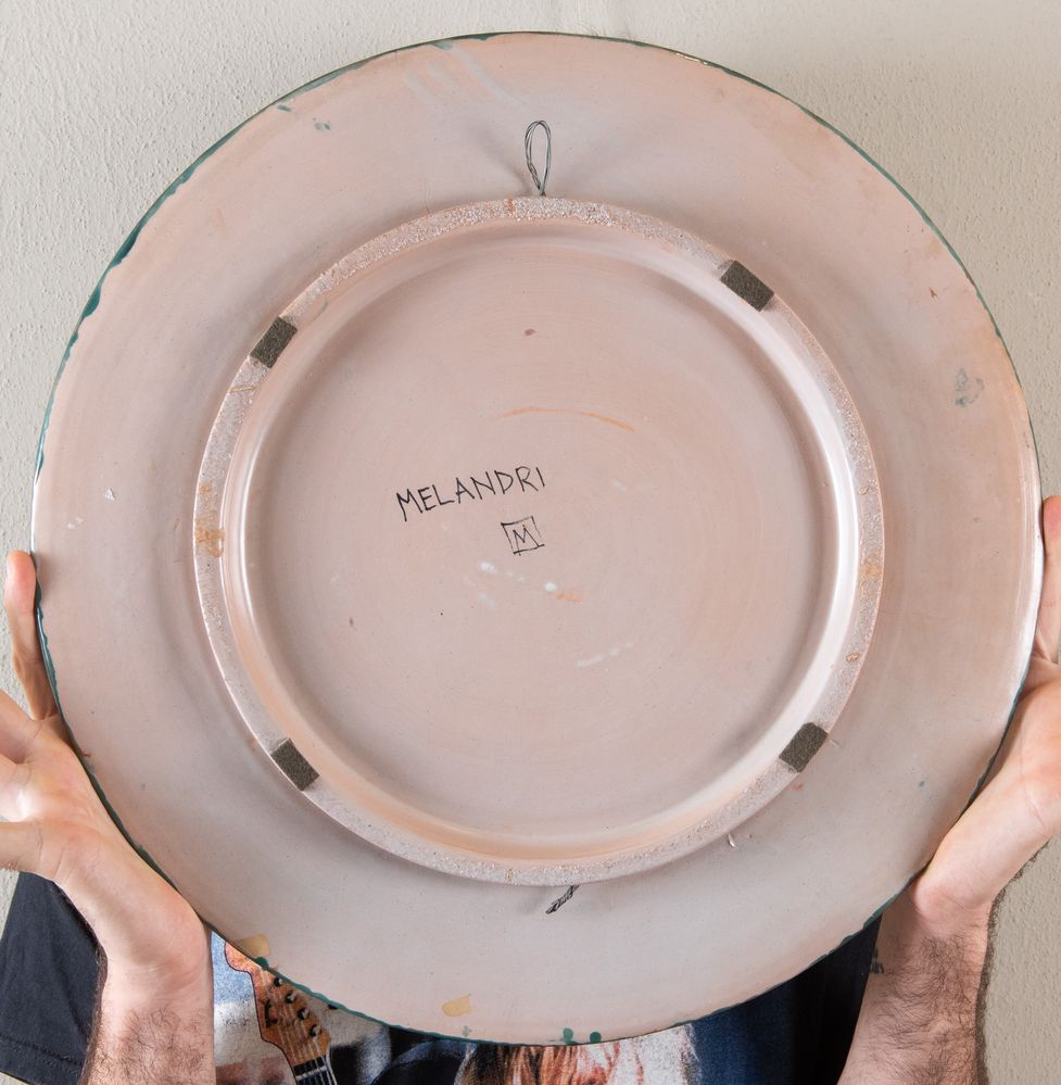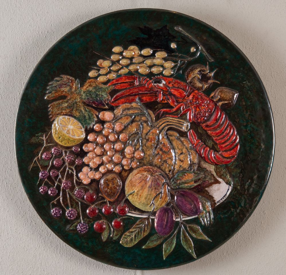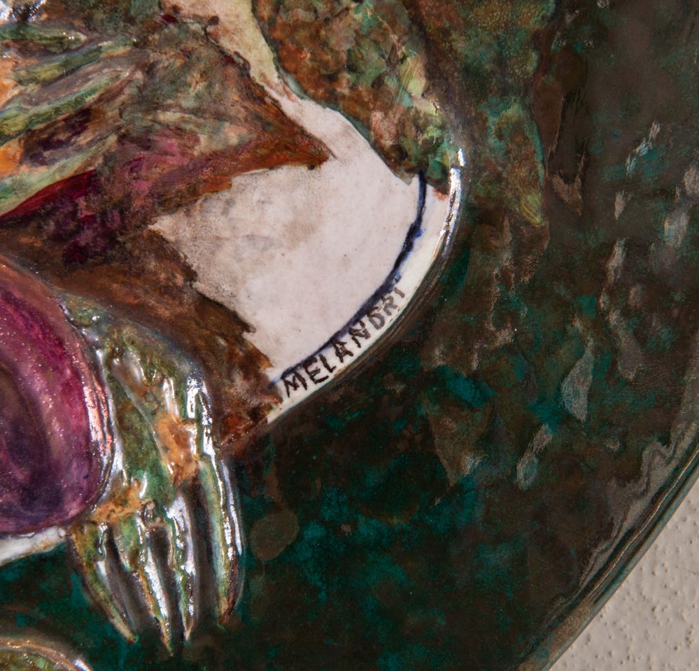 PIETRO MELANDRI (FAENZA, 1885 - 1976) "Grande piatto con frutta e aragosta", anni '50 del XX secolo. Diametro: cm 46,5. Ceramica policroma rifinita all'acido con bassorilievo di natura morta con frutta e aragosta. Firmato sul fronte in basso a destra e nel retro "Melandri" e "M" inquadrata. Firmato sul fronte in basso a destra e nel retro "Melandri" e "M" inquadrata. Bibliografia: Pietro Melandri ceramiche dagli anni '50 al 1976, catalogo pubblicato in occasione della mostra nella sede centrale della Banca Popolare di Faenza del 1996.