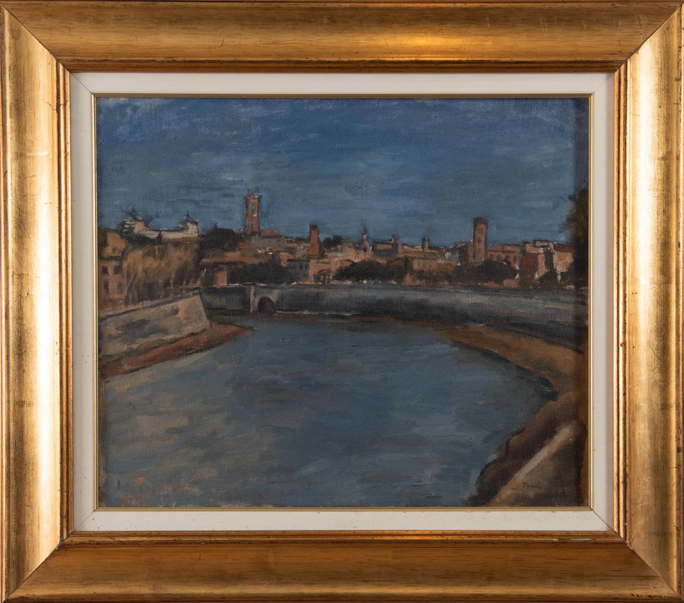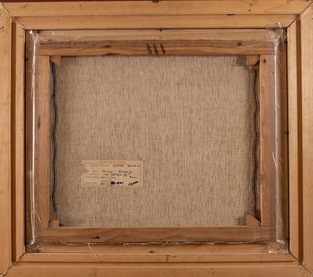 ORFEO TAMBURI (Jesi 1910 - Parigi 1994) "Paesaggio romano". Anni '40. Olio su tela. Cm 50x60. Opera firmata in basso a destra Tamburi. Al retro reca etichetta descrittiva. Al retro reca scritta "provenienza Hotel Corona Cortina". Opera accompagnata da autentica su fotografia a firma del maestro in data 4 Dicembre 1972.