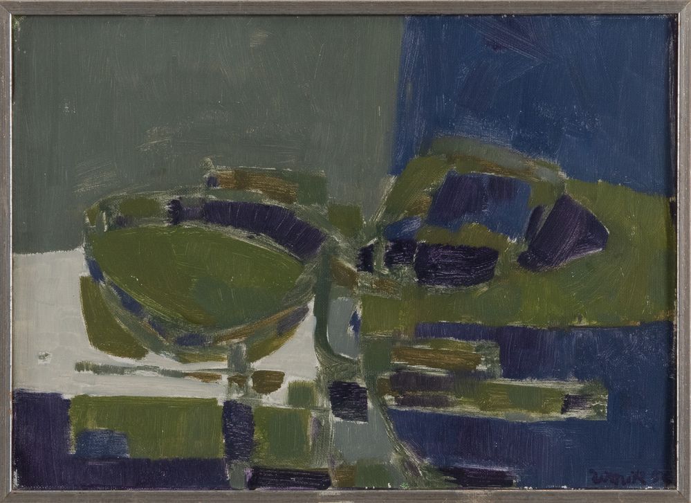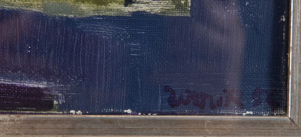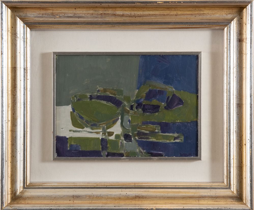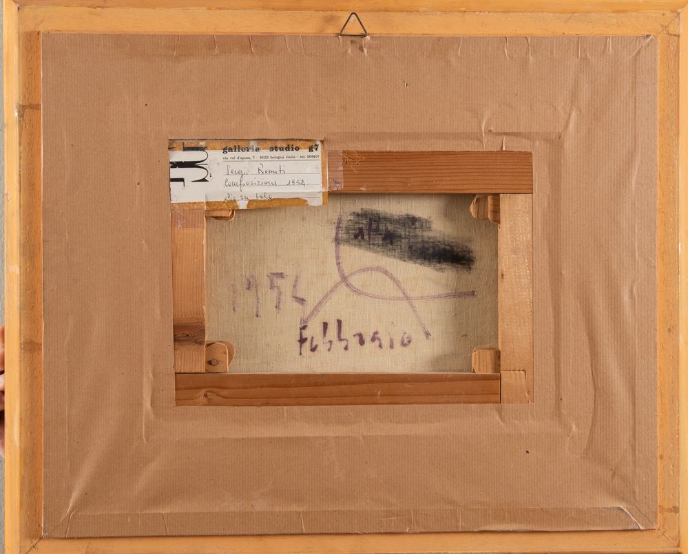 SERGIO ROMITI (Bologna 1928 - 2000) "Composizione", 1954. Olio su tela. Cm 25x35. Opera firmata e datata in basso a destra Romiti 54. Al retro opera datata Febbraio 1954. Al retro reca etichetta della Galleria Studio G7. Opera accompagnata da autentica su fotografia a firma del maestro e con timbro della Galleria Studio G7.