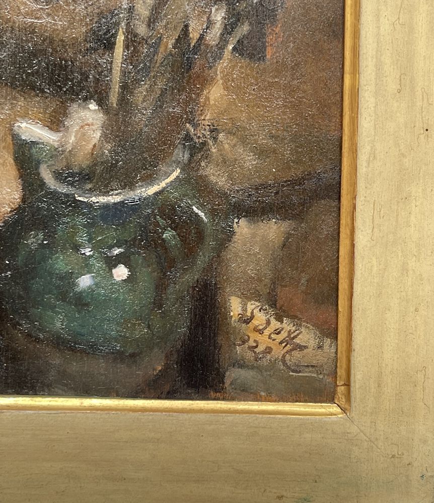 BRUNO SAETTI (Bologna 1902 - 1984) "Nello studio", 1928. Olio su tavola. Cm 42,5x33. Opera firmata e datata in basso a destra Saetti 928. Provenienza importante collezione privata Bologna.