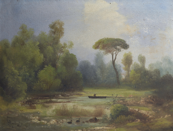 Henry Markò (Firenze, 1855 - Lavagna, Genova, 1921) PAESAGGIO CON STAGNO Olio su tela, cm. 46x58,5 Firma in basso a sinistra.