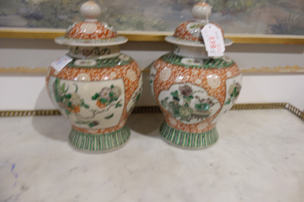 Coppia di potiches con coperchio decorate in policromia Cina sec.XIX