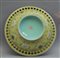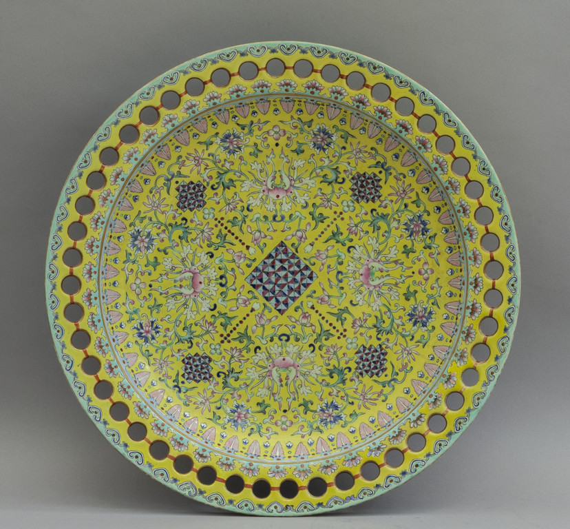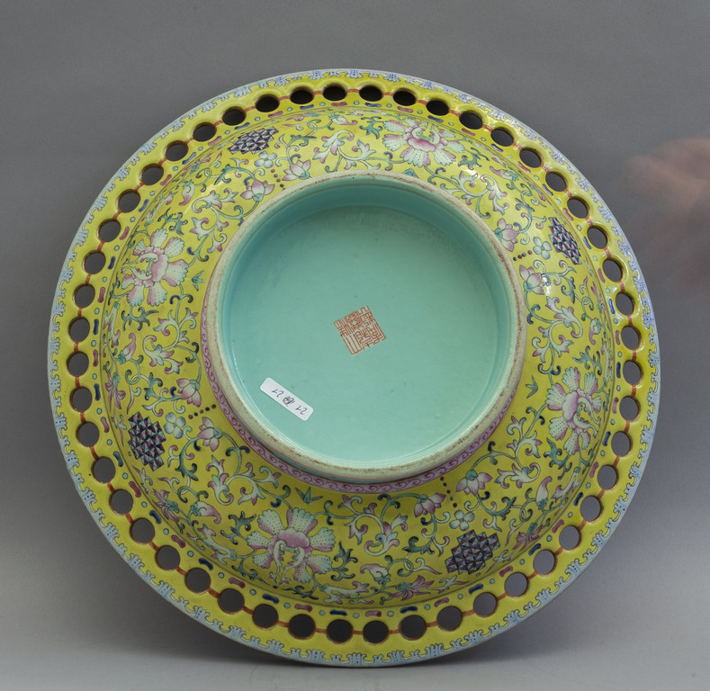 Piatto alzata in porcellana Famiglia rosa a fondo giallo decorato a fiori con peonie e motivi geometrici marcato alla base