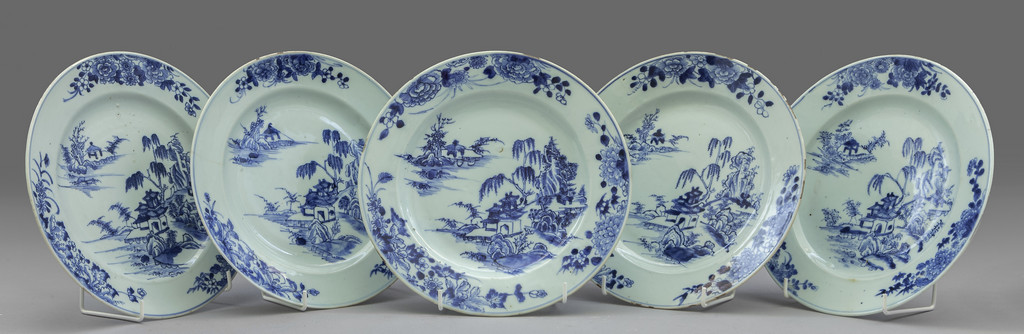Cinque piatti in porcellana decorati in bianco e blu a paesaggi Cina sec.XVIII