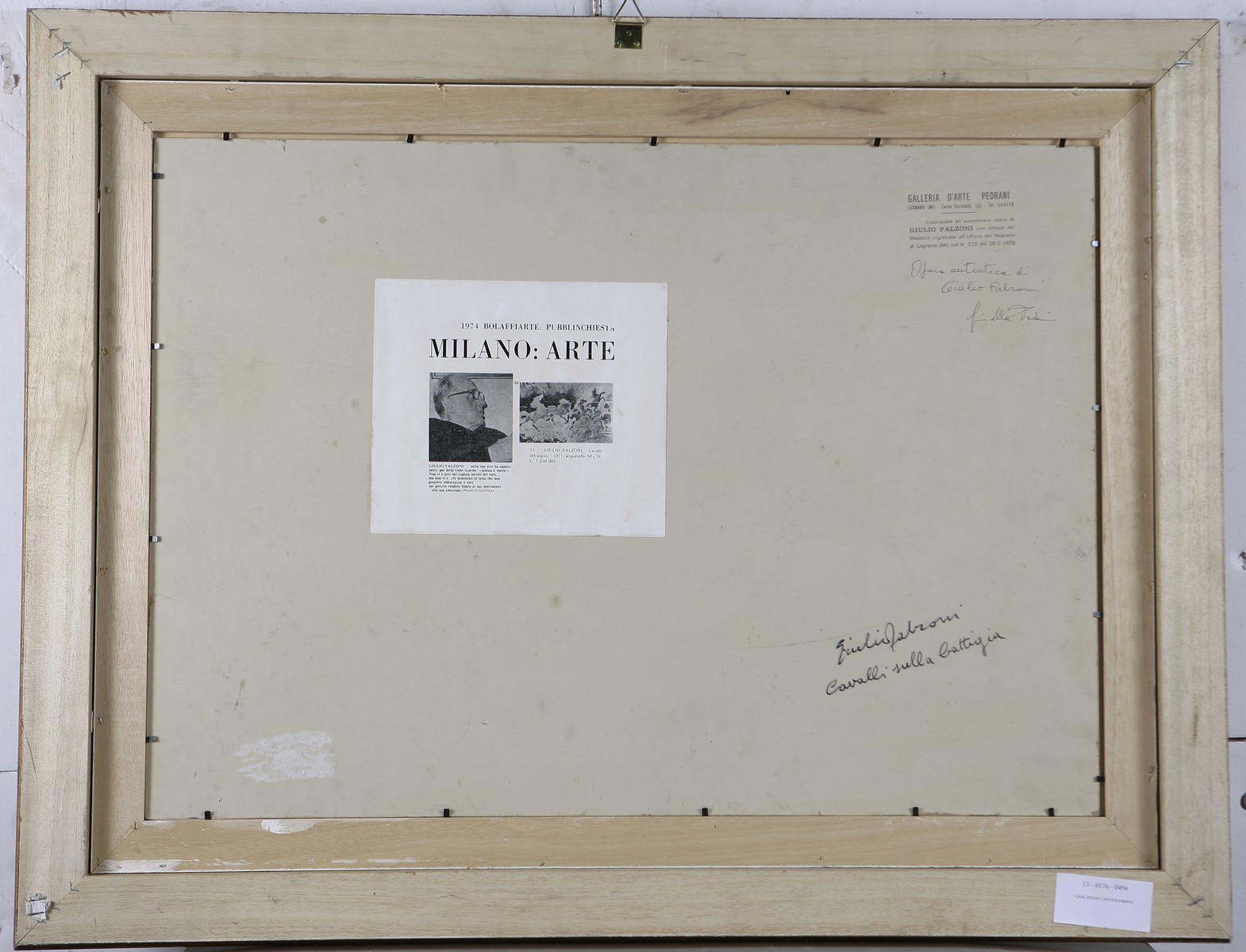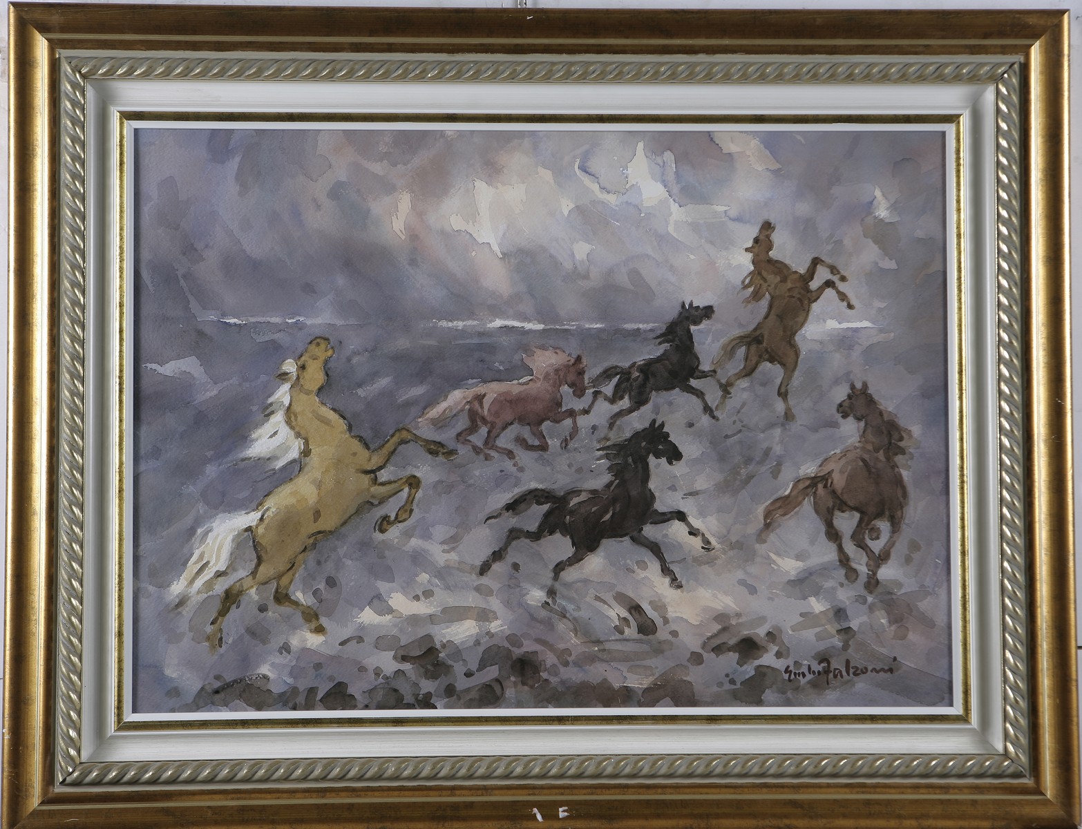 FALZONI GIULIO (1900 - 1978) Cavalli sulla battigia. Acquerello su cartone. Cm 70,00 x 50,00. Firma in basso a destra. Al retro firma per autentica, titolo, cartiglio Milano:Arte e timbro della Galleria d'arte Pedrani, Legnano (MI). Cornice presente