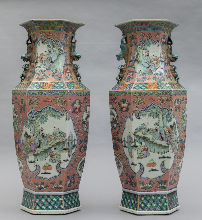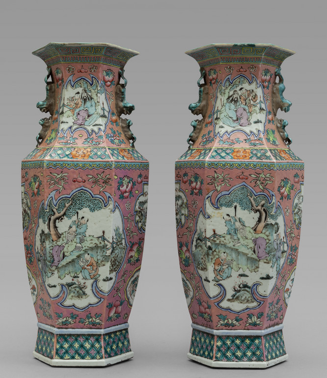 Coppia di vasi di forma ottagonale in porcellana Famiglia Rosa decorati con riserve con personaggi Cina sec. XIX (lievi sbeccature)