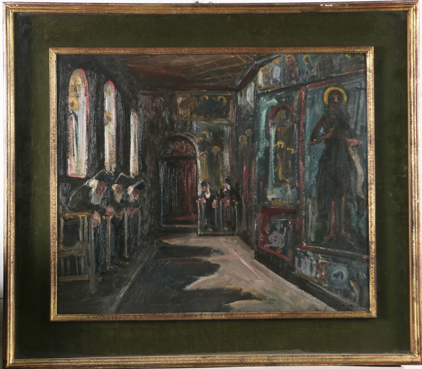 MATTIOLI ARMENO (n. 1920) Preghiera a Monte Athos. 1967. Olio su cartone. Cm 60,00 x 45,00. Firma e data in basso a destra. Al retro firma, titolo e data. Cornice presente