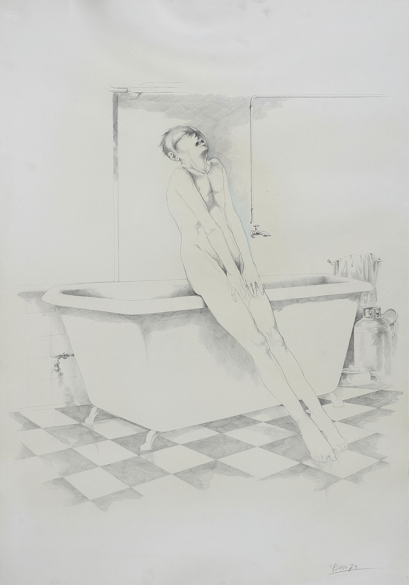 BIFFI LUIGI (1930 - 1974) Uomo in bagno. 1973. Tecnica mista su carta. Cm 50,00 x 70,00. Firma e data in basso a destra. Cornice presente