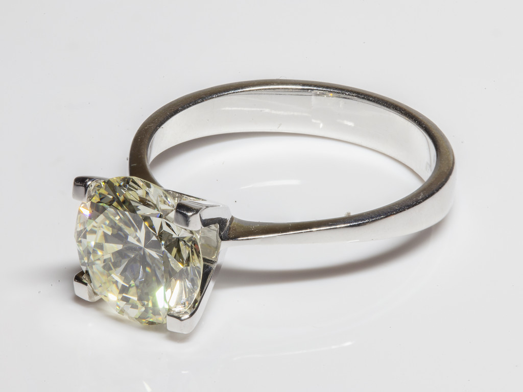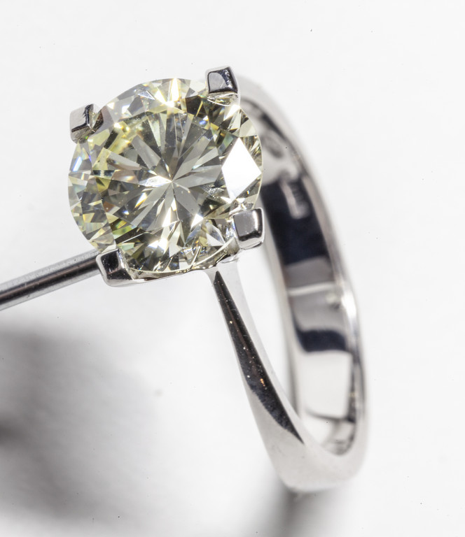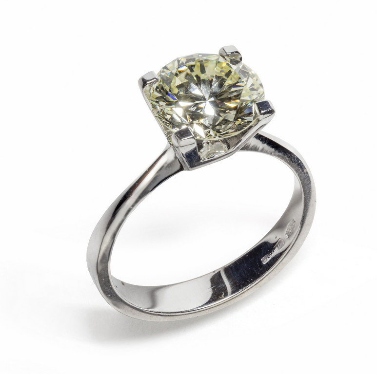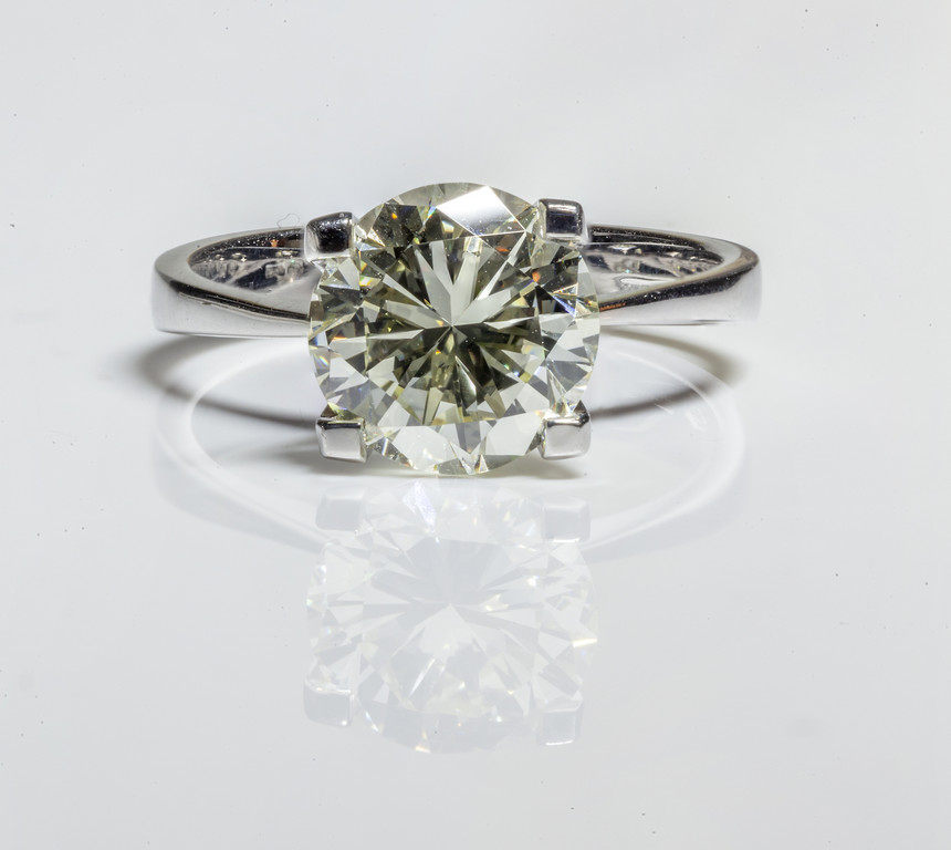 Anello solitario in oro bianco con diamante centrale di forma rotonda taglio a brillante di misura 9 11 mm x 9 12 mm del peso stimato di 2 80 ct circa.