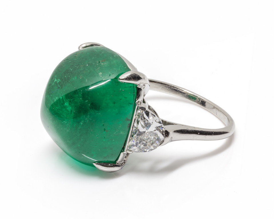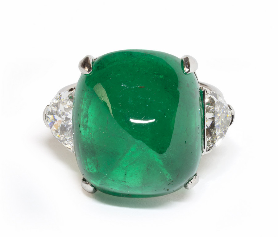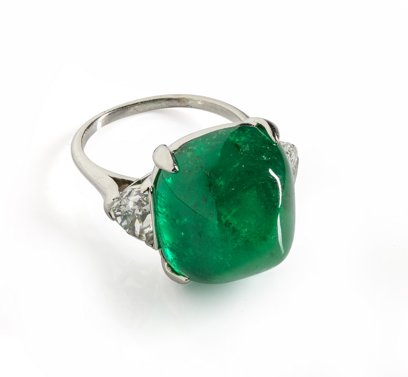 Anello in platino ??? con smeraldo taglio sugarloaf di 20 00 ct circa e due diamanti taglio triangolare per tot ct 1 20 circa