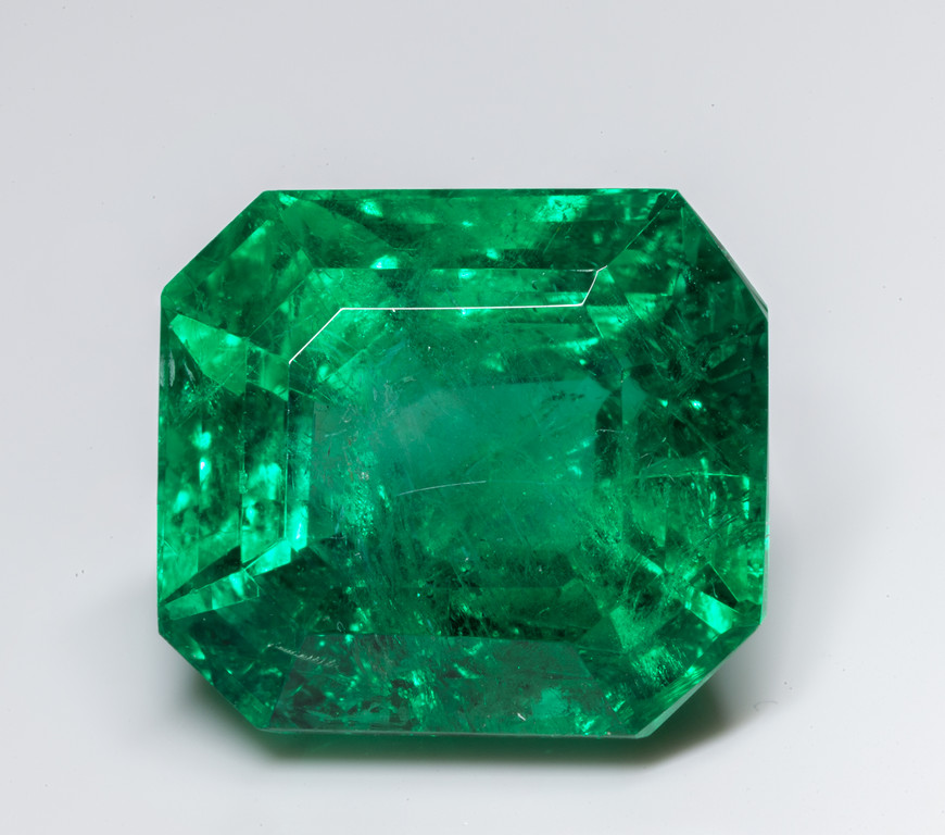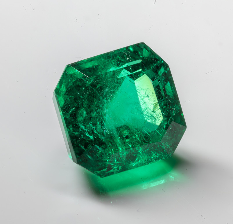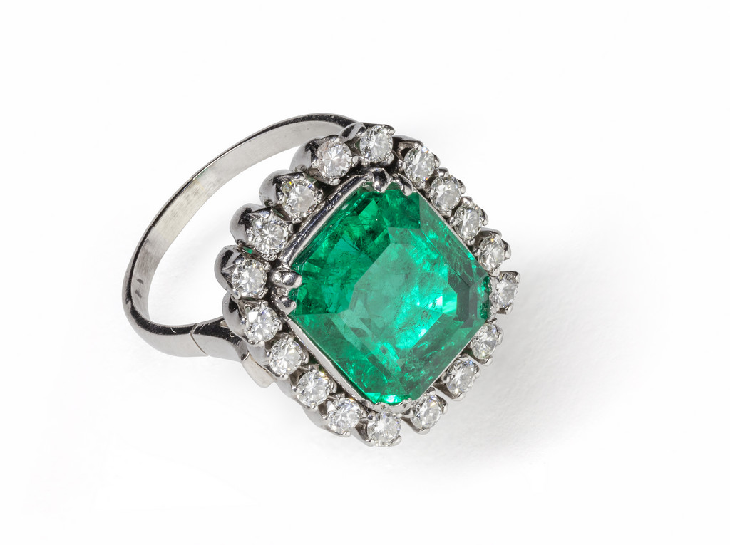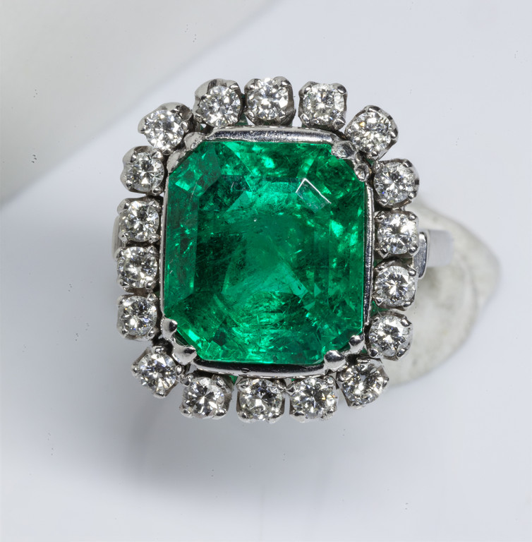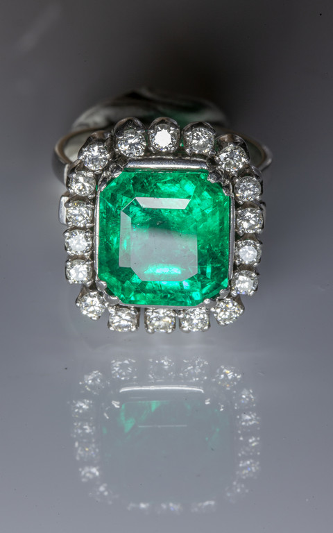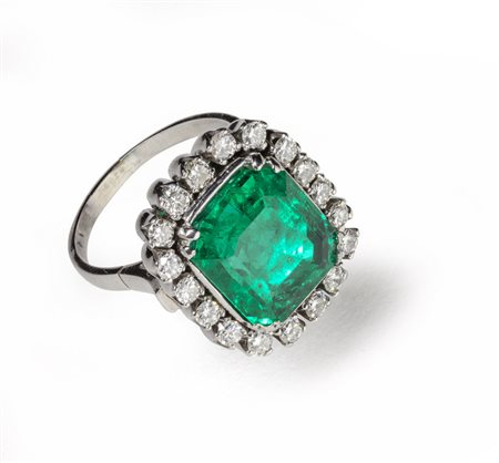 Anello in platino e diamanti con importante smeraldo colombiano di forma rettangolare taglio a gradini di 9 59 ct accompagnato da report Gubelin N°21100054 del 25/10/2021 attestante l'origine colombiana e la presenza di minori (Minor oil) residui di olio nelle fessure. Gemstone Rating Gubelin 87.1