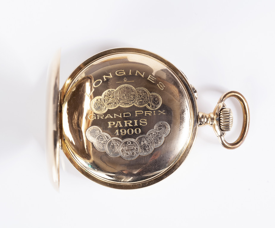 LONGINES orologio da tasca in oro rosso con lavorazione guilloché e stemma sul retro cassa.