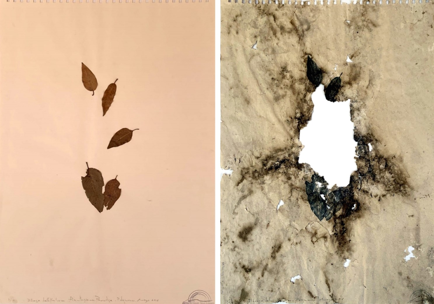 tecnica mista e foglie su carta, 70x50 cm cad.