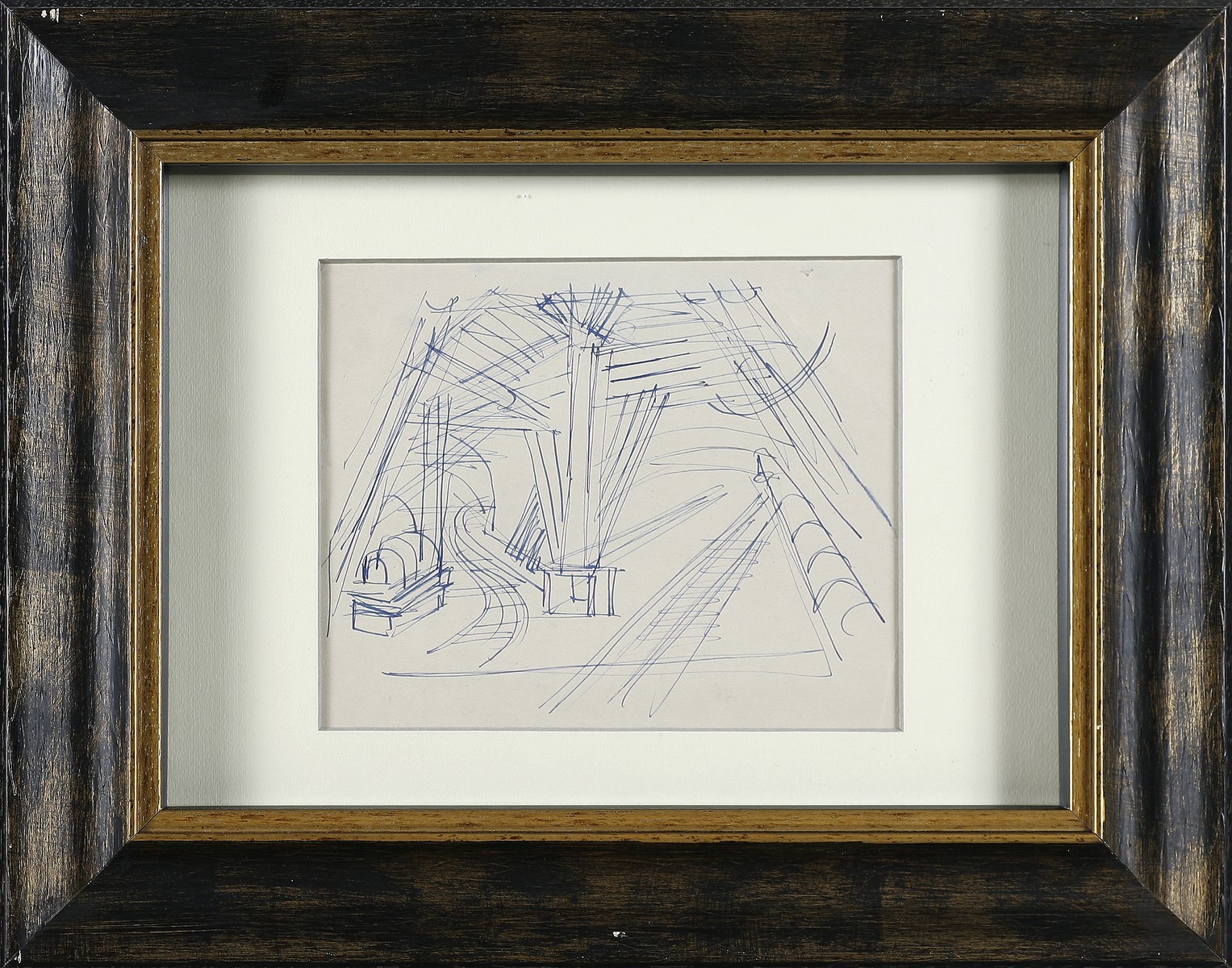 DEPERO FORTUNATO (1892 - 1960) La subway a New York. Inchiostro blu su carta. Cm 23,80 x 19,80. Studio per dipinto. Anni 1948/49 circa. Opera archiviata presso l'Archivio unico per il catalogo delle opere futuriste di Fortunato Depero, Rovereto, come da documentazione fotografica allegata riportante il relativo numero d'archivio. Cornice presente