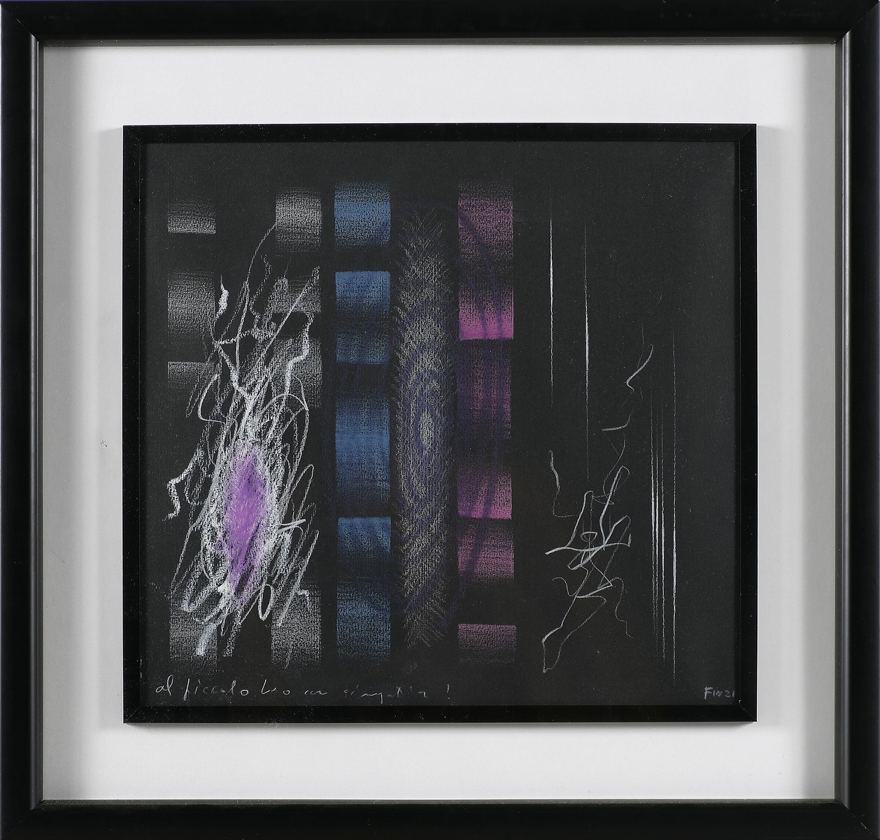 FINZI ENNIO (n. 1931) Senza titolo. 2010. Pastelli su cartoncino. Cm 35,00 x 33,00. Firma in basso a destra. Dedica in basso a sinistra. Opera archiviata presso l'Archivio Ennio Finzi, Venezia-Mestre, come da documentazione fotografica allegata riportante il relativo numero d'archivio. Cornice presente