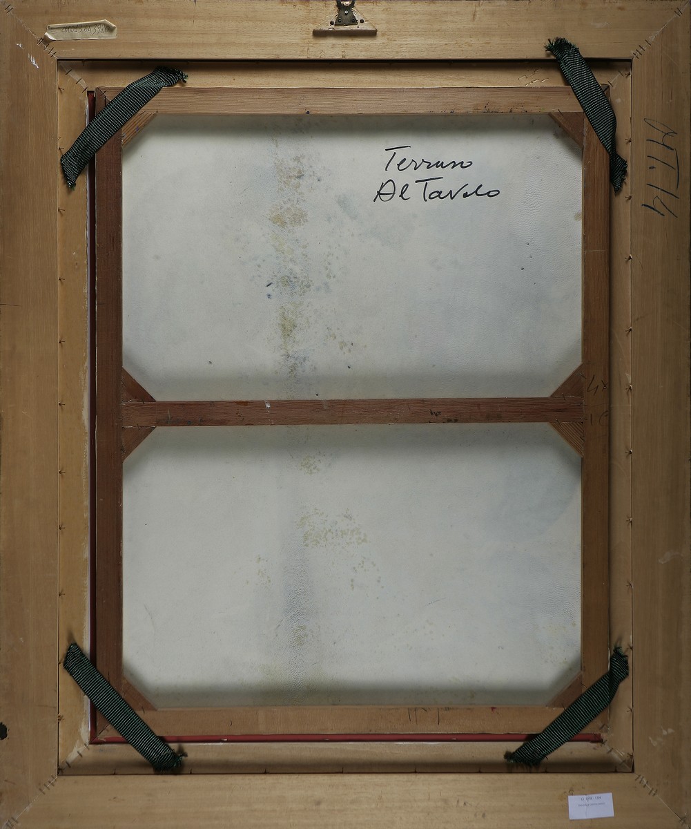 TERRUSO SAVERIO (1939 - 2003) Al tavolo. Olio su pergamena. Cm 80,00 x 100,00. Firma in basso a destra. Al retro firma e titolo. Autentica dell'artista su fotografia. Cornice presente