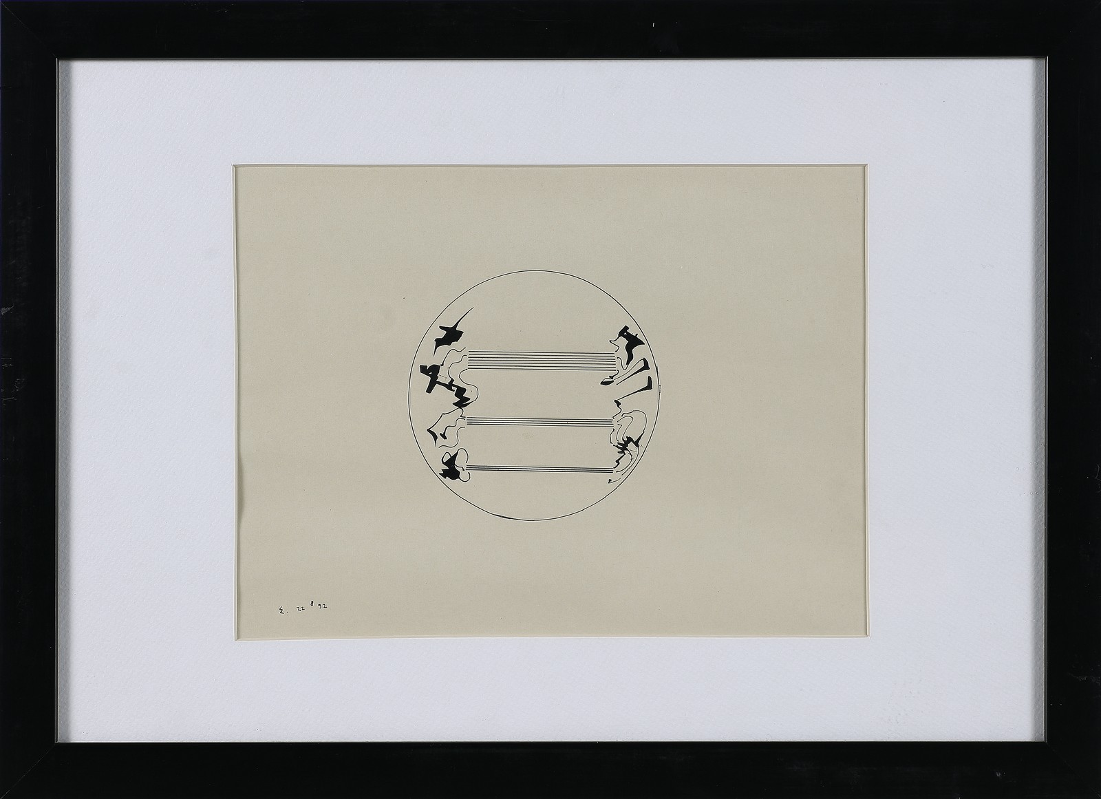 JANNINI ERNESTO (n. 1950) Senza titolo. 1992. China su carta. Cm 32,00 x 23,50. Siglato e datato in basso a sinistra. Al retro cartiglio descrittivo a cura della Galleria Oprandi arte contemporanea, Boltiere (BG). Opera pubblicata sul libro Ernesto Jannini:Satellite, a cura di RenatoBarilli e Lisa Ponti, ed. Loft Arte Club, a pag. 42. Cornice presente