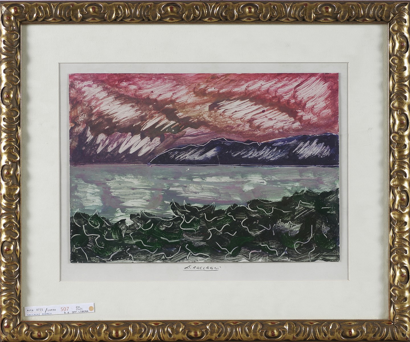 RACCAGNI ANDREA (1921 - 2005) Senza titolo. Tecnica mista su carta. Cm 35,50 x 24,50. Firma in basso. Autentica su fotografia a cura del figlio dell'artista riportante il numero d'archivio. Cornice presente