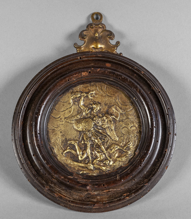 Placca in bronzo dorato raffigurante San Michele Arcangelo cornicetta coeva in legno ebanizzato sec.XVIII