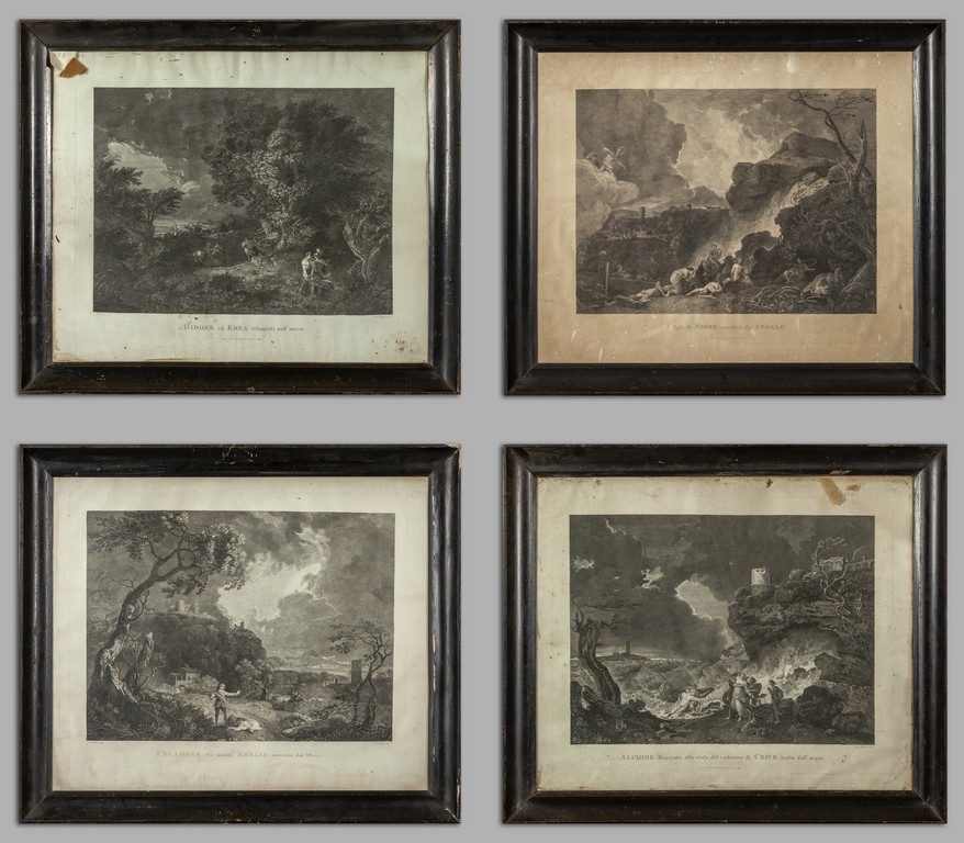 'Scene mitologiche' quattro incisioni da R.Wilson cornici in legno ebanizzato sec.XIX
