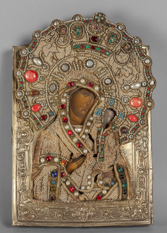 6- 'Madre di Dio di Tichvin' icona tempera e argento su tavola sec.XIX (nel retro cartellino collezione Davide Orler)