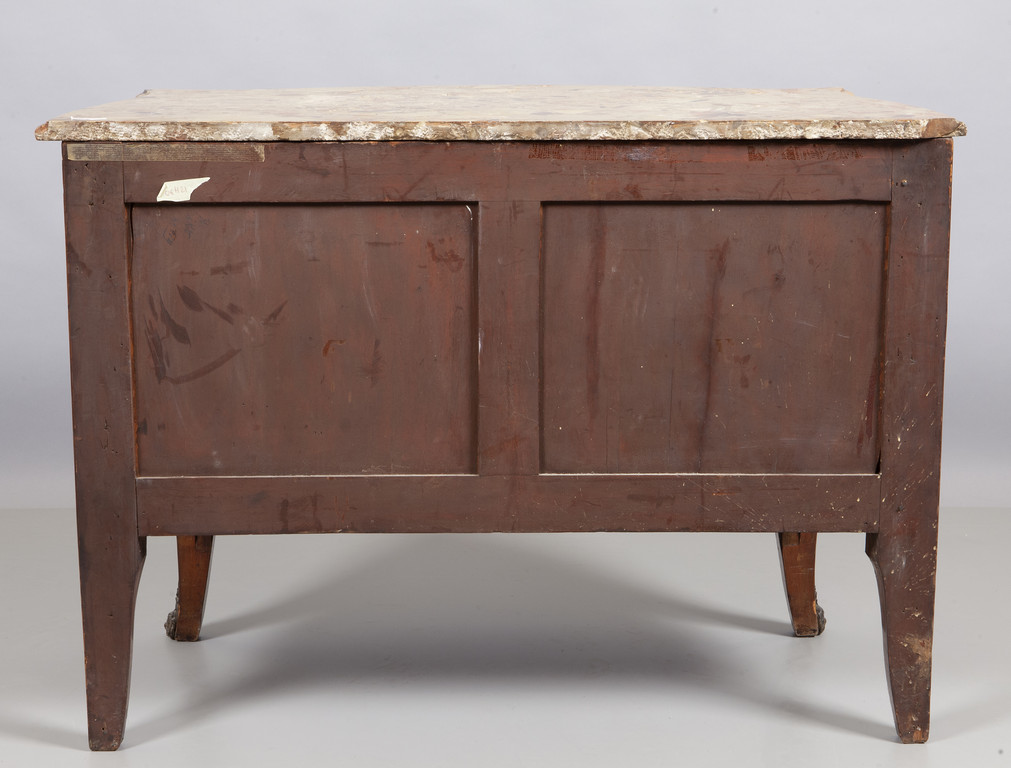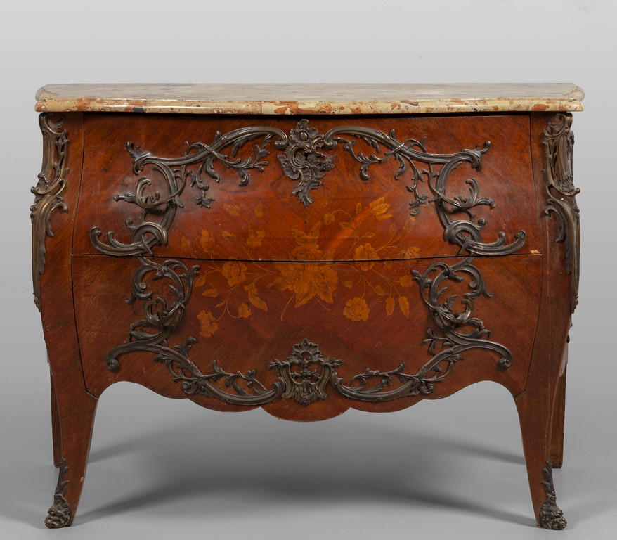 Comò in stile Luigi XV impiallacciato a motivi floreali ricca decorazione in bronzo piano in marmo Francia sec.XX