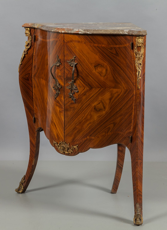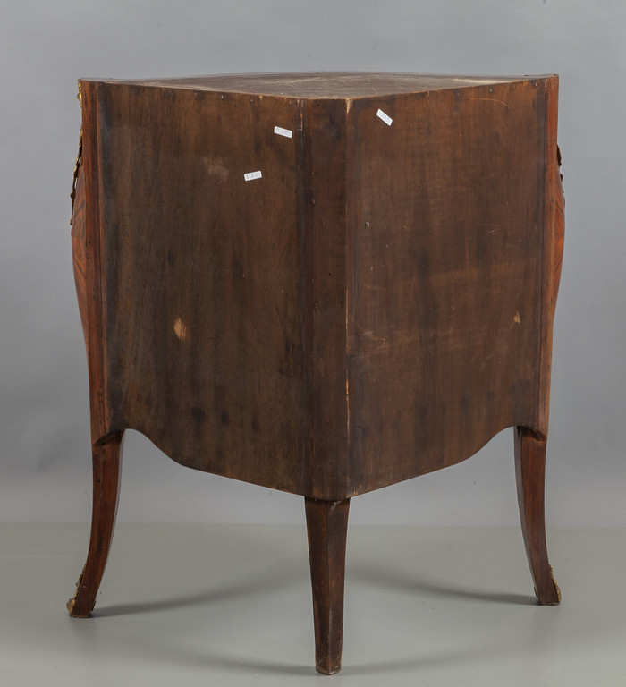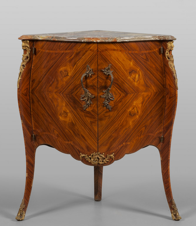Angonale in stile Luigi XV lastronato in palissandro movimentato sul fronte ricca decorazione in bronzo Francia sec.XX