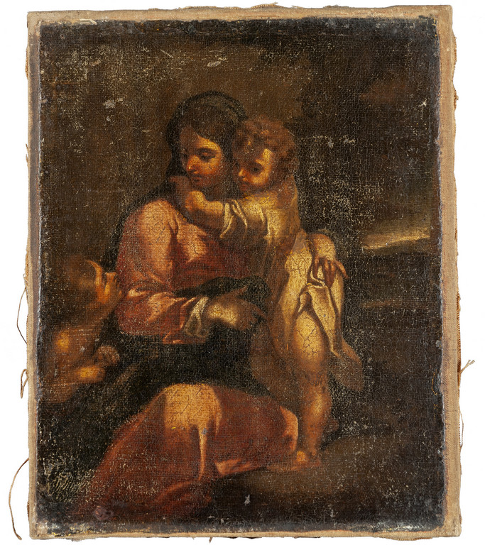Scuola emiliana sec.XVII 'Madonna con Bambino e San Giovannino' olio (gravi mancanze)