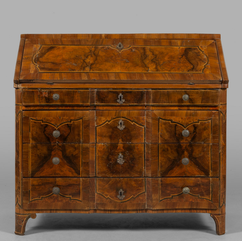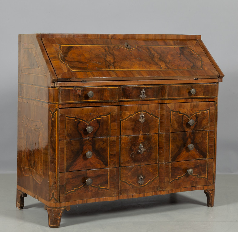 Ribalta in stile Luigi XIV a tre cassetti più uno con calatoia montanti arrotondati lastronata in noce e radica di noce con filetti in acero e palissandro