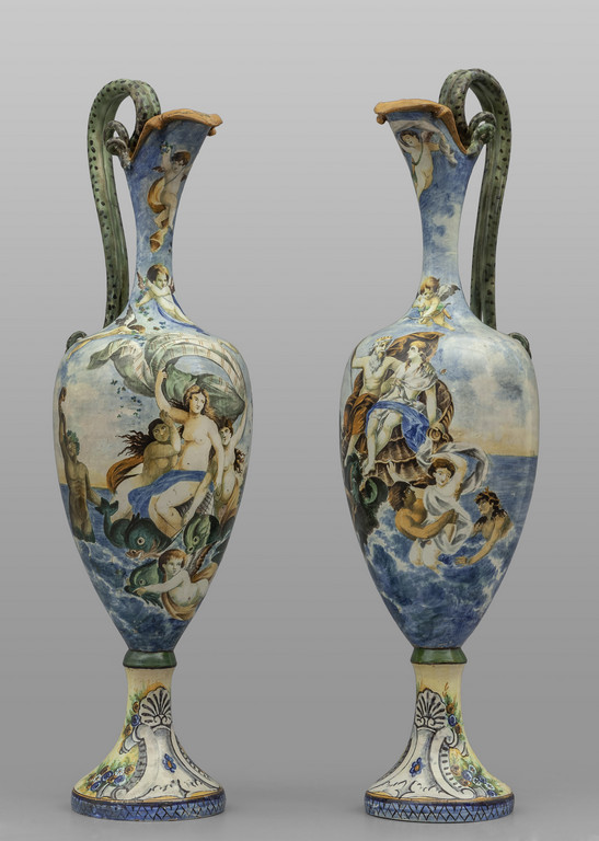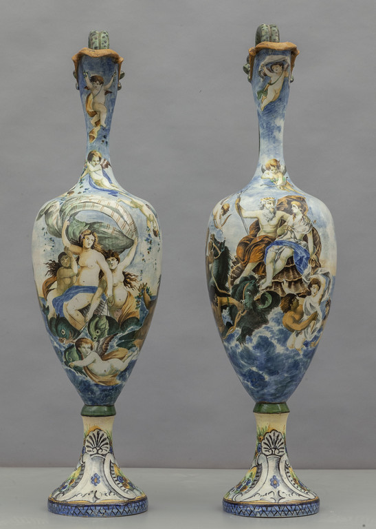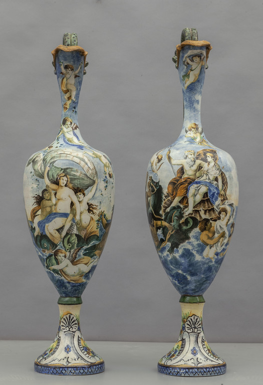 Coppia di grandi vasi ad anfora in terracotta decorati in policromia con scene mitologiche sec.XIX