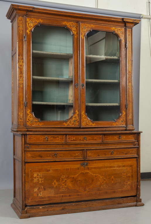 Libreria a doppio corpo lastronata ed intarsiata in legno di frutto Piemonte sec.XVIII (difetti)