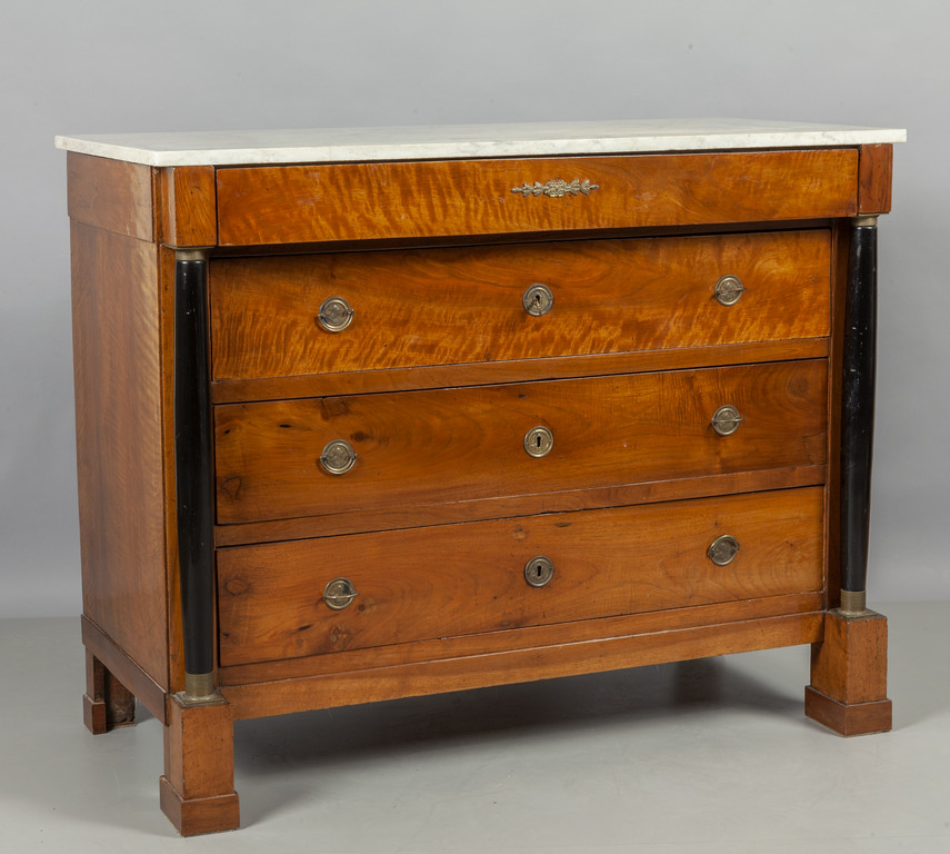 Comò Impero a tre cassetti più uno lastronato in noce piano in marmo colonne a tutto tondo in legno ebanizzato Italia sec.XIX