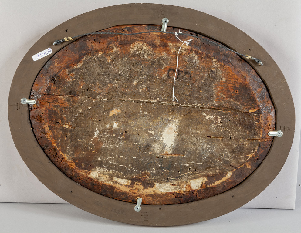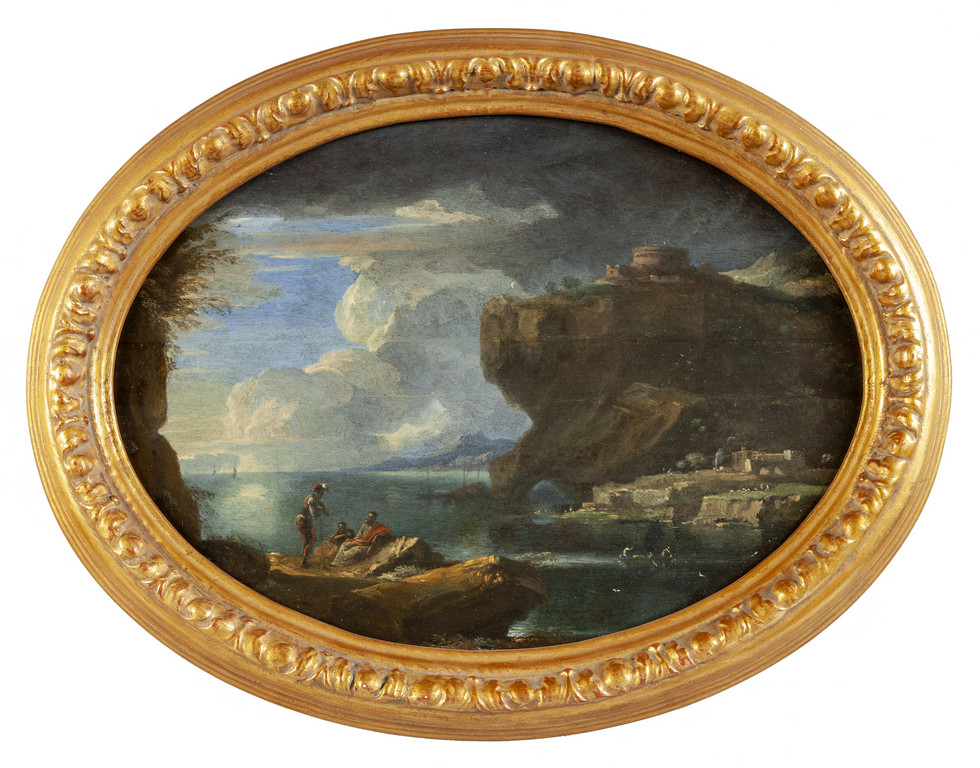 Scuola genovese sec.XVIII 'Paesaggio animato da figure' olio su tavola di forma ovale (difetti)